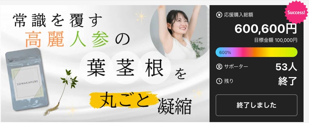 「国産の高麗人参を探していた」「植物工場での管理栽培という安心感に惹かれた」といった応援コメントを多数いただき、健康意識の高い層を中心に、希少な国産素材への期待の高さが裏付けられる結果となりました。