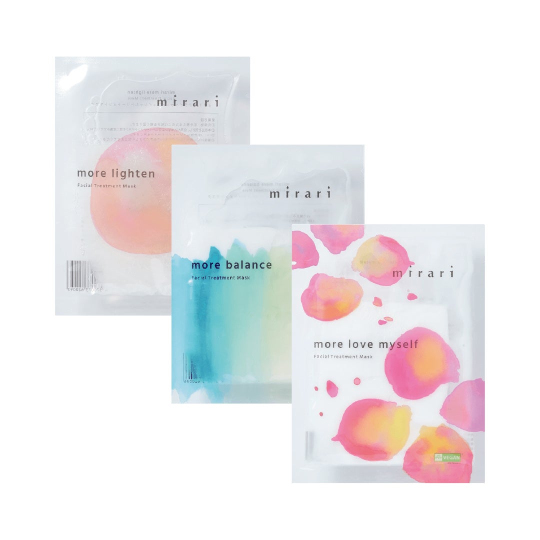 「more love myself」、「more balance」、「more lighten」の3種類が1枚ずつ入ったシートマスクキット。それぞれミラリの想いとともに、異なったたっぷりの美容液成分が入ったシートマスクを体験できる特別なセットです。