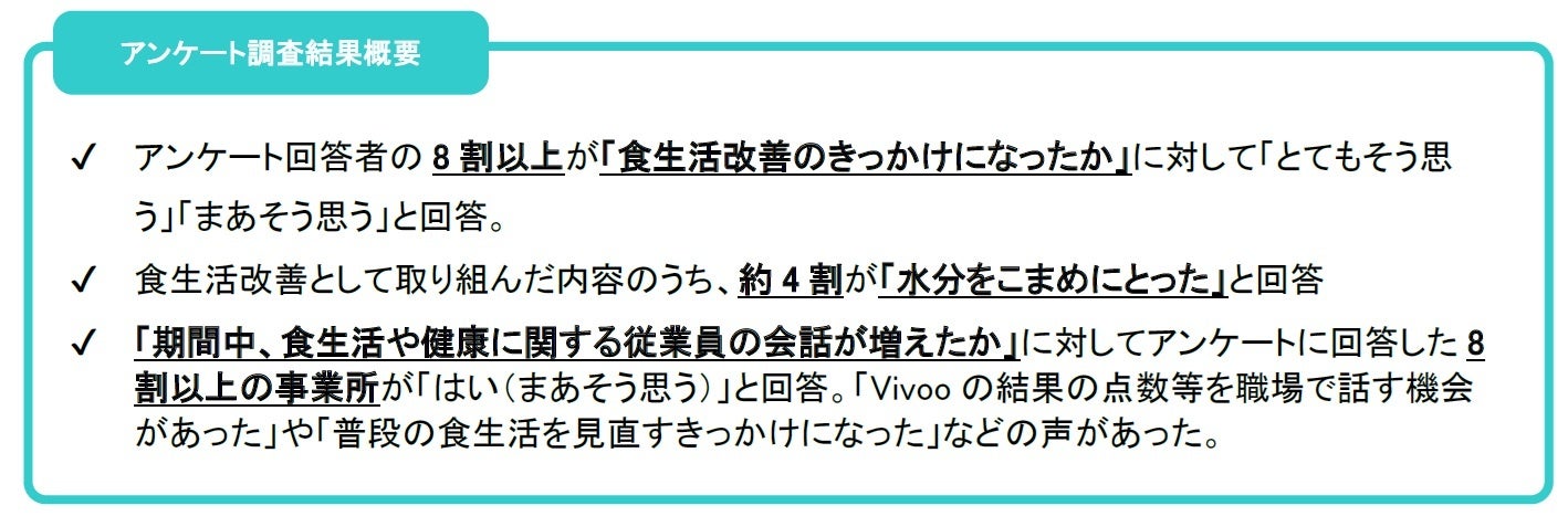 2.  アンケート回答に回答した参加事業所の8割以上が「食生活や健康に関する従業員の会話が増えた」と回答。「Vivooの結果の点数等を職場で話す機会があった」や「普段の食生活を見直すきっかけになった」などの声