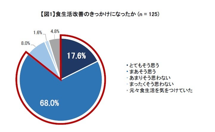 1.アンケート回答者の8割以上が「食生活改善のきっかけになった」と回答。自身の食生活を見直すきっかけとなり、特に水分レベルについては回答者の約4割が「水分をこまめにとった」と回答