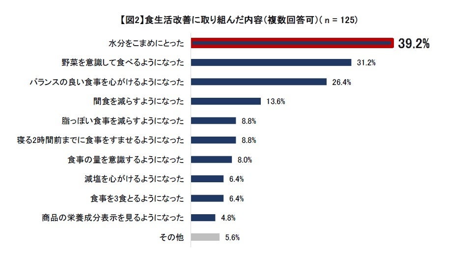 「食のチャレンジ2025」の参加者に対して今回の取り組みが食生活改善のきっかけとなったかを聞いたところアンケート回答者の8割の人が「少なからずそう思った」と回答しました【図1】。「Vivoo」を活用したことで自身の食生活を見直すきっかけになったことが見て取れます。さらに食生活の改善に取り組んだ内容も聞いたところ、約4割が「水分をこまめにとった」と回答しました【図2】。水分、野菜の摂取に加え、間食や油っぽい食事を減らすなど、Vivooのテスト結果項目以外にも意識を広げた人がいました。