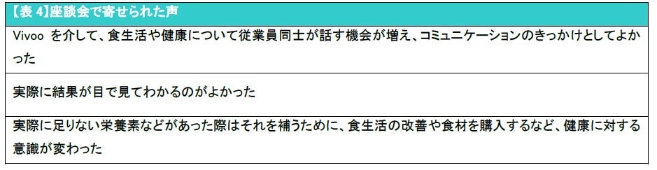 2.  アンケート回答に回答した参加事業所の8割以上が「食生活や健康に関する従業員の会話が増えた」と回答。「Vivooの結果の点数等を職場で話す機会があった」や「普段の食生活を見直すきっかけになった」などの声