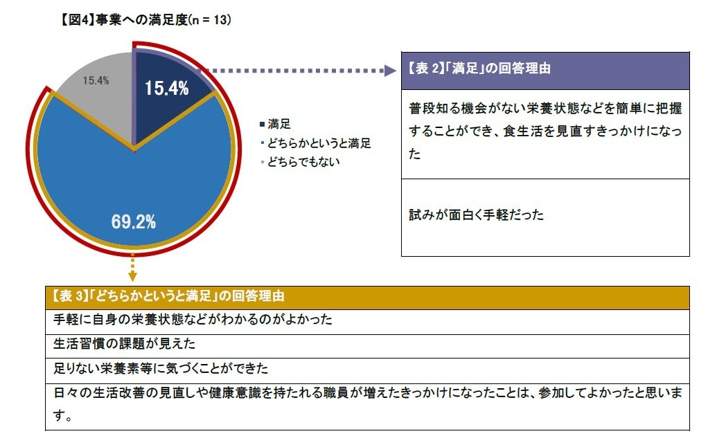 また、本事業に関する満足度も聞いたところアンケート回答のうち8割以上の事業所が「満足」もしくは「どちらかというと満足」と回答しました【図4】。「手軽に自身の栄養状態などがわかるのが良かった」や「食生活の課題が見えた」等、取り組み自体に満足度が高かったことが目に見て取れます【表2】【表3】。