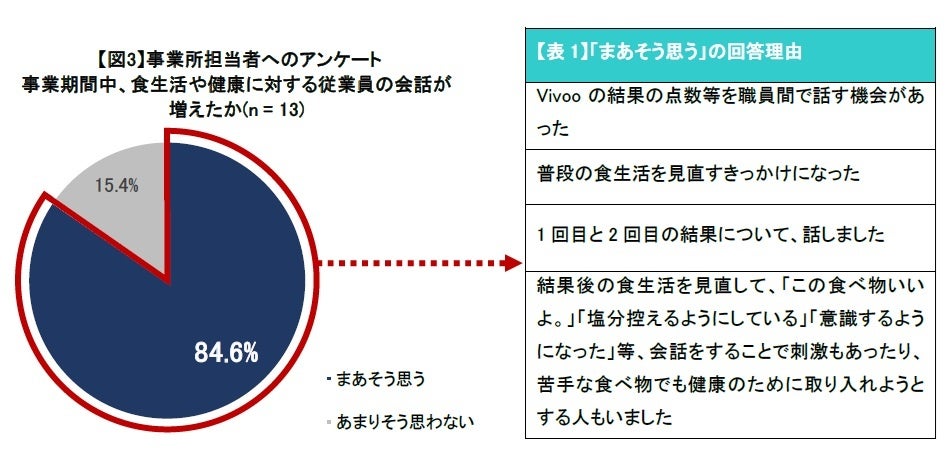 事業実施期間中に食生活や健康に関して従業員同士の会話が増えたかどうかを聞いたところ、8割以上の事業所が「そう思う」と回答しました【図3】。また、そう思った背景には「Vivooの結果の点数等を職場で話す機会があった」や「普段の食生活を見直すきっかけになった」などの声がありました【表1】。