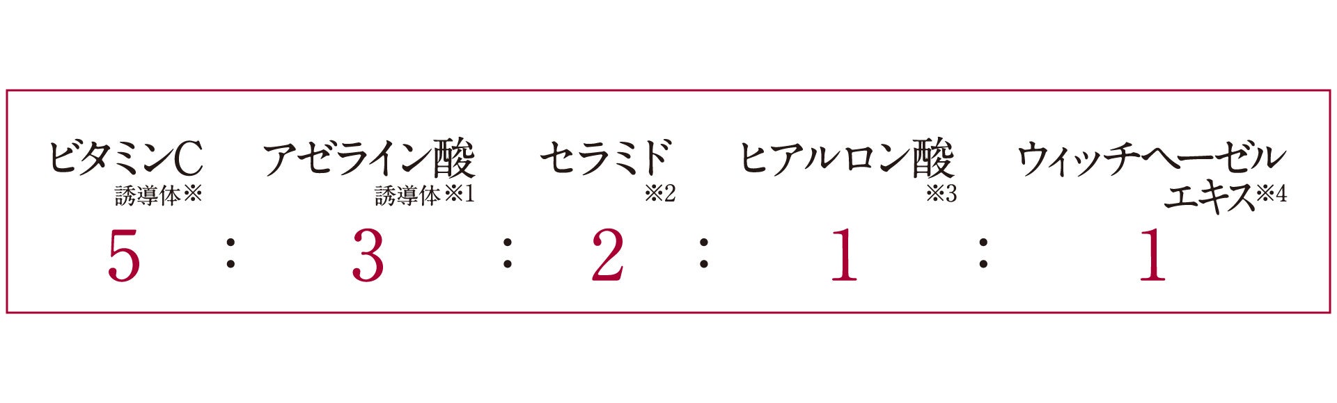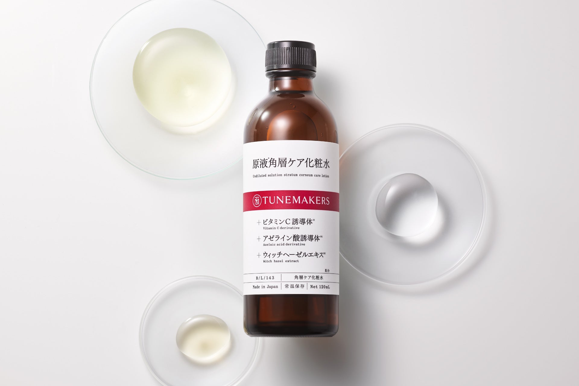*チューンメーカーズ「ビタミンC誘導体(リン酸アスコルビルMg(整肌成分))」、「アゼライン酸誘導体(アゼロイルジグリシンK(整肌成分)」、「ウィッチヘーゼルエキス(ハマメリス葉エキス(保湿成分))」、「セラミド(コメヌカスフィンゴ糖脂質(保湿成分))」、「ヒアルロン酸(保湿成分)」 *1チューンメーカーズ「ビタミンC誘導体(リン酸アスコルビルMg(整肌成分))」、「アゼライン酸誘導体(アゼロイルジグリシンK(整肌成分))」、「セラミド(コメヌカスフィンゴ糖脂質(保湿成分))」、「ヒアルロン酸(保湿成分)」、「ウィッチヘーゼルエキス(ハマメリス葉エキス(保湿成分))」 *2乾燥してキメが乱れ毛穴が目立った肌状態のこと *3乾燥、ハリ不足、キメの乱れ