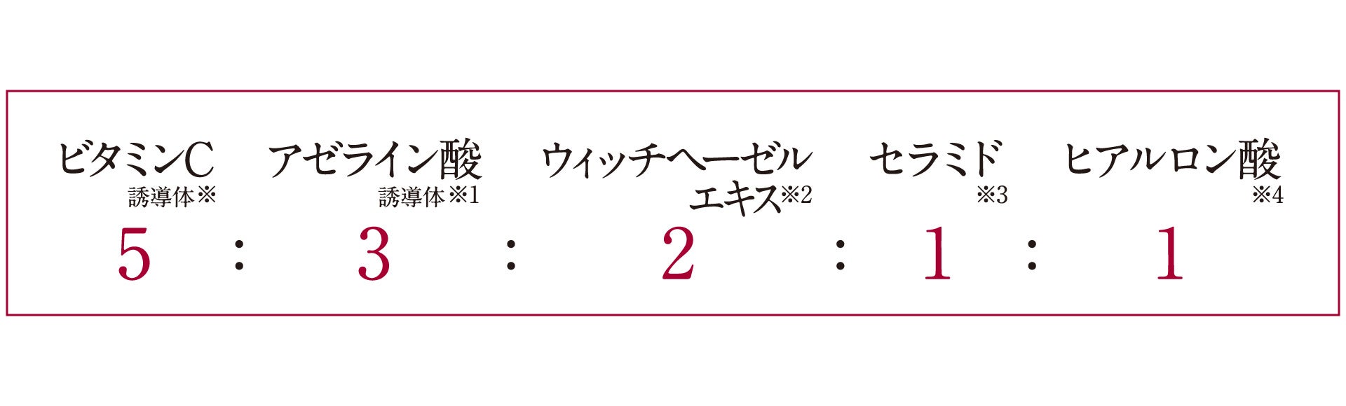 *チューンメーカーズ「ビタミンC誘導体(リン酸アスコルビルMg(整肌成分))」、「アゼライン酸誘導体(アゼロイルジグリシンK(整肌成分)」、「ウィッチヘーゼルエキス(ハマメリス葉エキス(保湿成分))」、「セラミド(コメヌカスフィンゴ糖脂質(保湿成分))」、「ヒアルロン酸(保湿成分)」 *1チューンメーカーズ「ビタミンC誘導体(リン酸アスコルビルMg(整肌成分))」、「アゼライン酸誘導体(アゼロイルジグリシンK(整肌成分))」、「セラミド(コメヌカスフィンゴ糖脂質(保湿成分))」、「ヒアルロン酸(保湿成分)」、「ウィッチヘーゼルエキス(ハマメリス葉エキス(保湿成分))」 *2乾燥してキメが乱れ毛穴が目立った肌状態のこと *3乾燥、ハリ不足、キメの乱れ