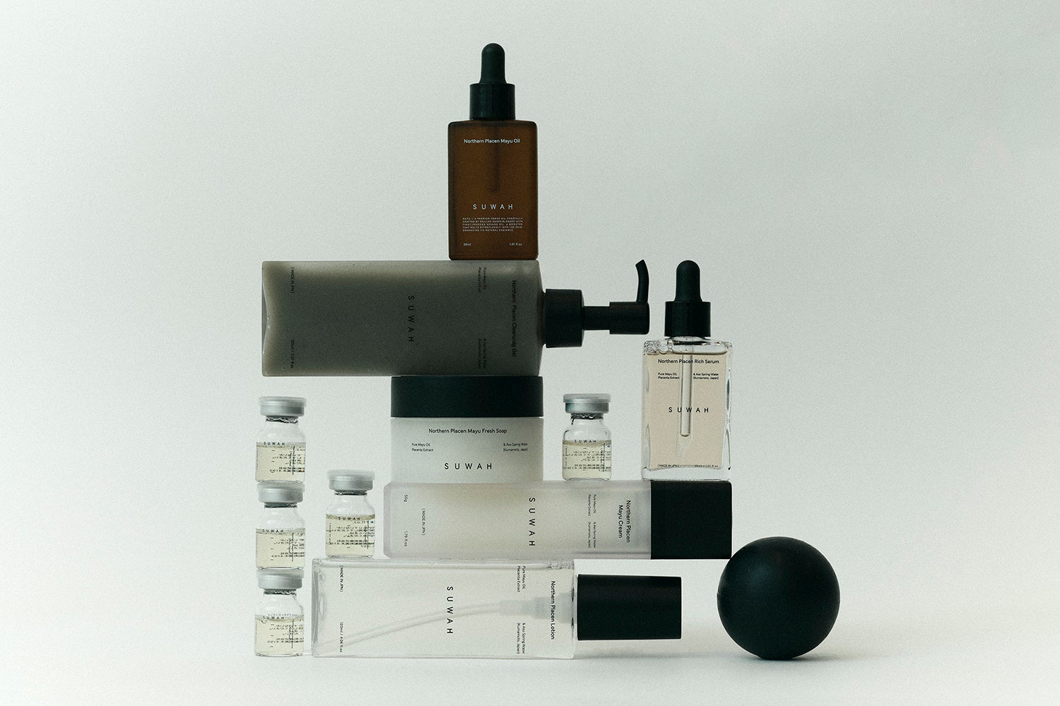 必要な成分を重ねていく。段階を踏むケア設計により、素材本来の力が無理なく発揮されるバランスを追求しました。世界最高峰の環境で育まれたプラセンタ、阿蘇の地下水、そして職人の手で精製された馬油。これらの恵みが心地よく肌になじむよう、工程・テクスチャー・使用感に至るまで細やかに設計しています。またSUWAHは、スキンケアの時間そのものを、自分自身と向き合うひとときとして大切にしています。手の温度を通して肌に触れることで、その日のコンディションに気づき、整える。その時間もまた、SUWAHが大切にするスキンケア設計の一部です。