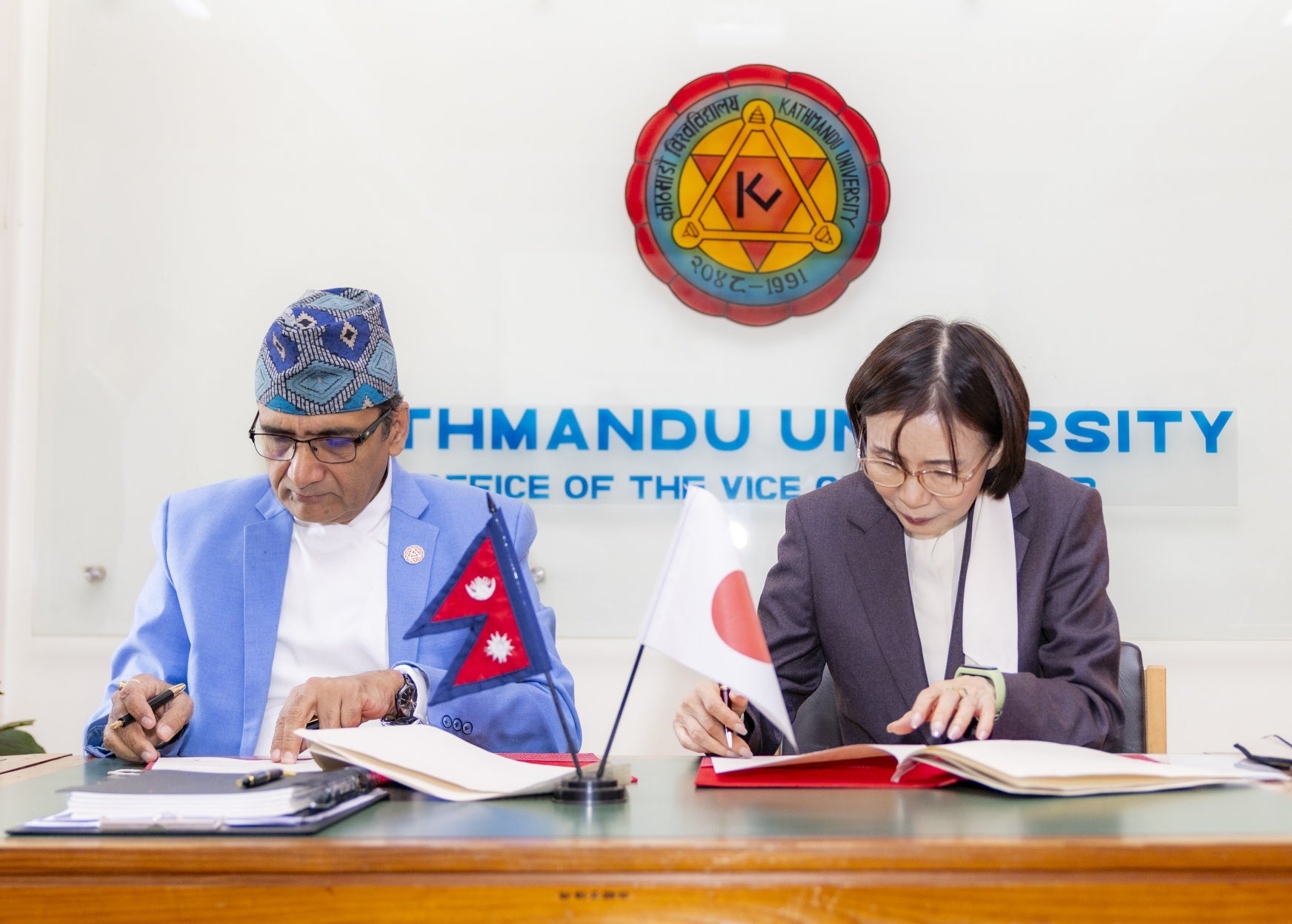 式典は2部構成で行われ、第1部では大学本部にてフォーデイズ代表の和田佳子とカトマンズ大学アチュート・プラサド・ワグレ学長による基本合意書への調印が行われ、新校舎建設に関して資金面を含め全面的に支援することで合意しました。第2部の起工式では、伝統的な点火の儀式「パナスライト」や建物デザインのお披露目が執り行われました。