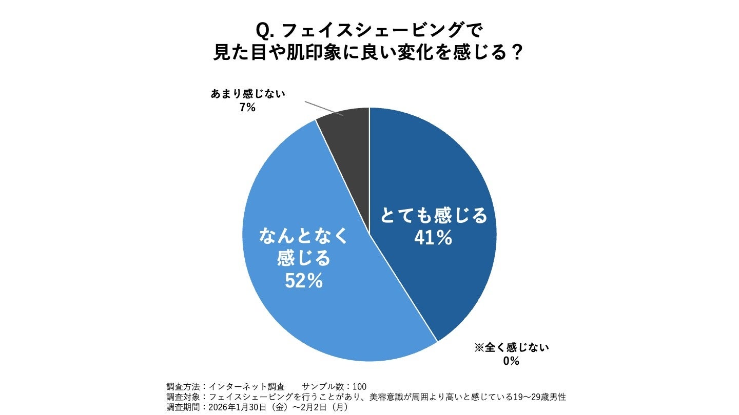 続いて、フェイスシェービングによって見た目や肌印象に良い変化を感じるかを調査。その結果、93%が「感じる」(とても感じる:41%、なんとなく感じる:52%の合計)と回答。多くの美容男子がフェイスシェービングによる肌印象の変化を実感しており、美容の一部として捉えている様子がうかがえます。