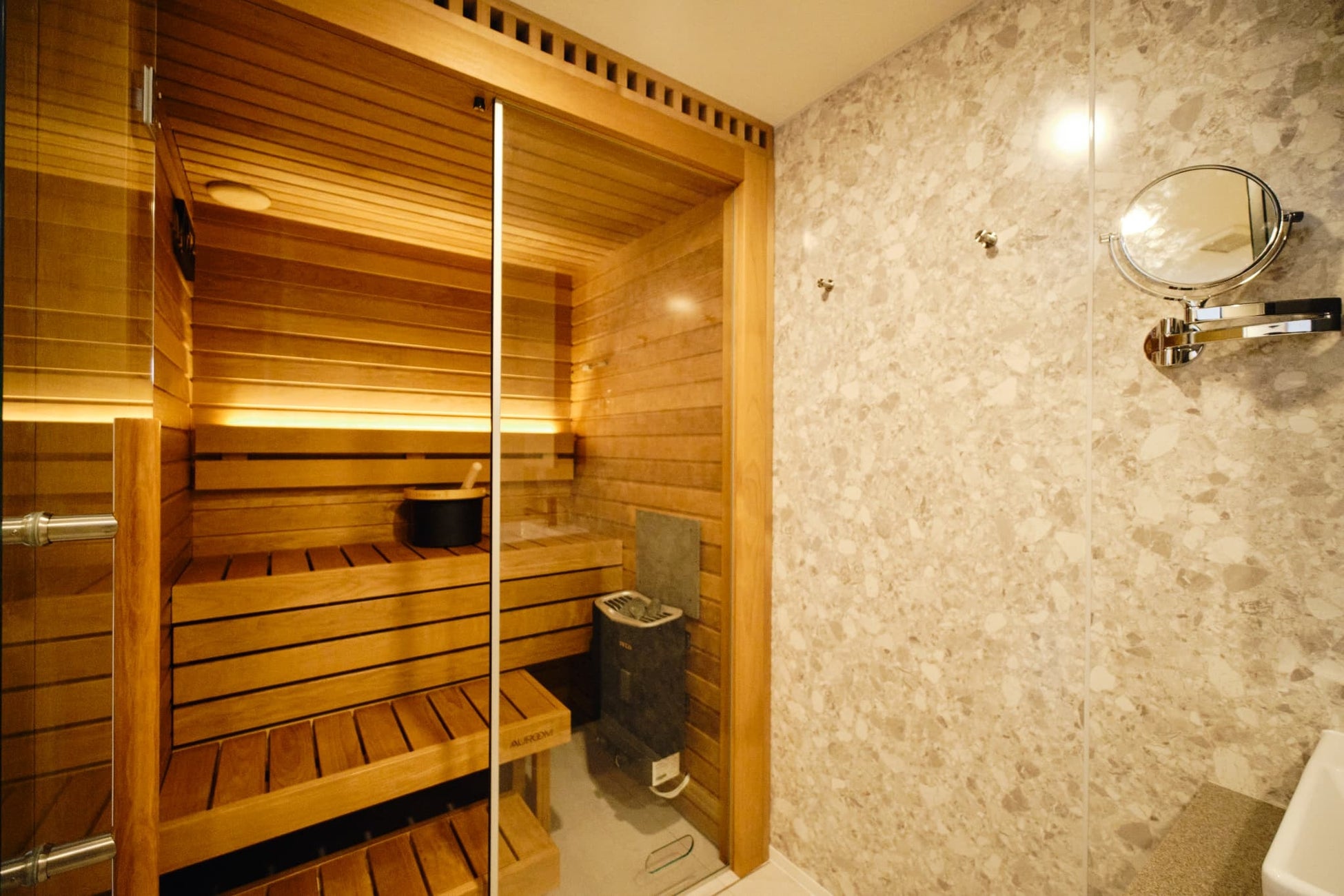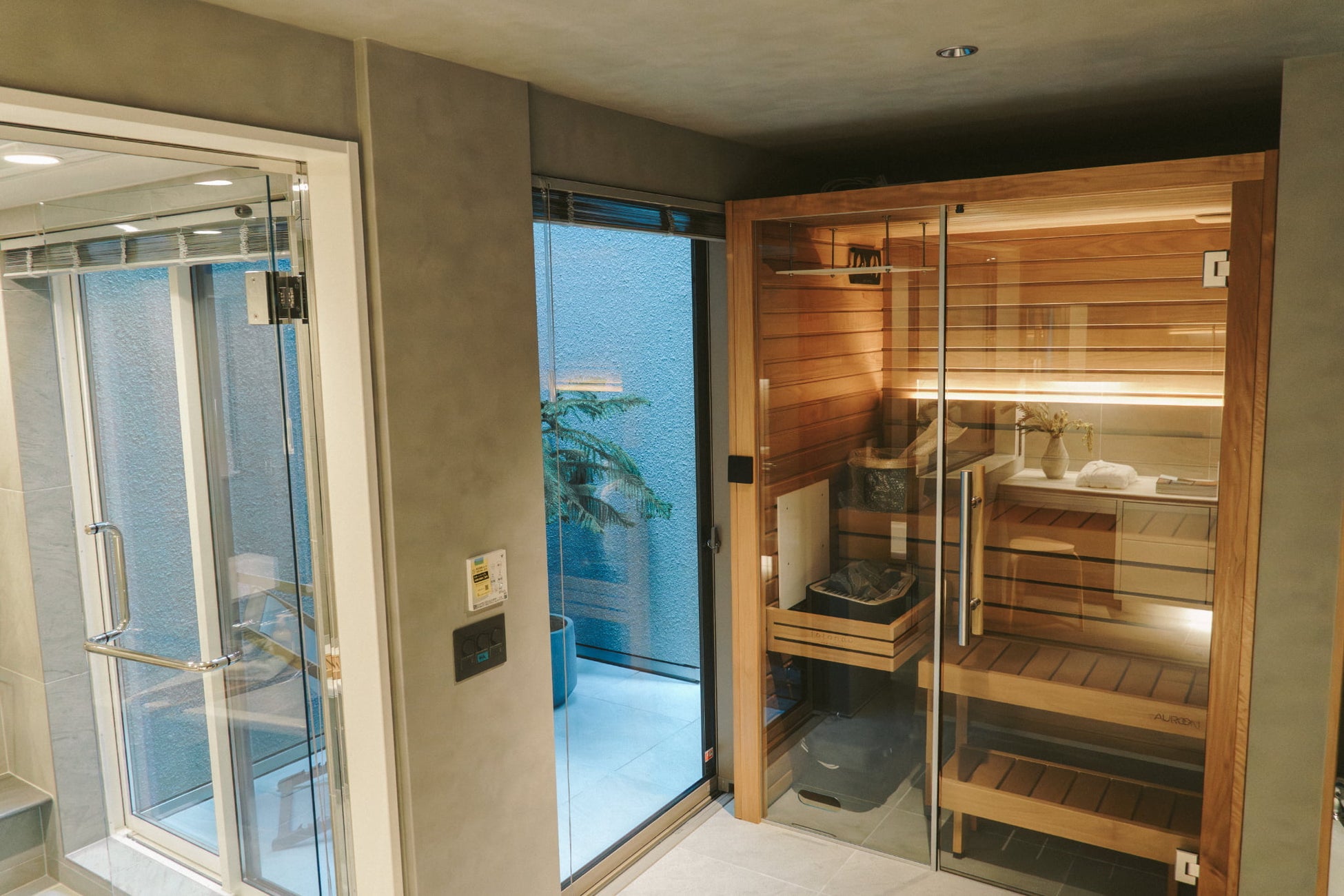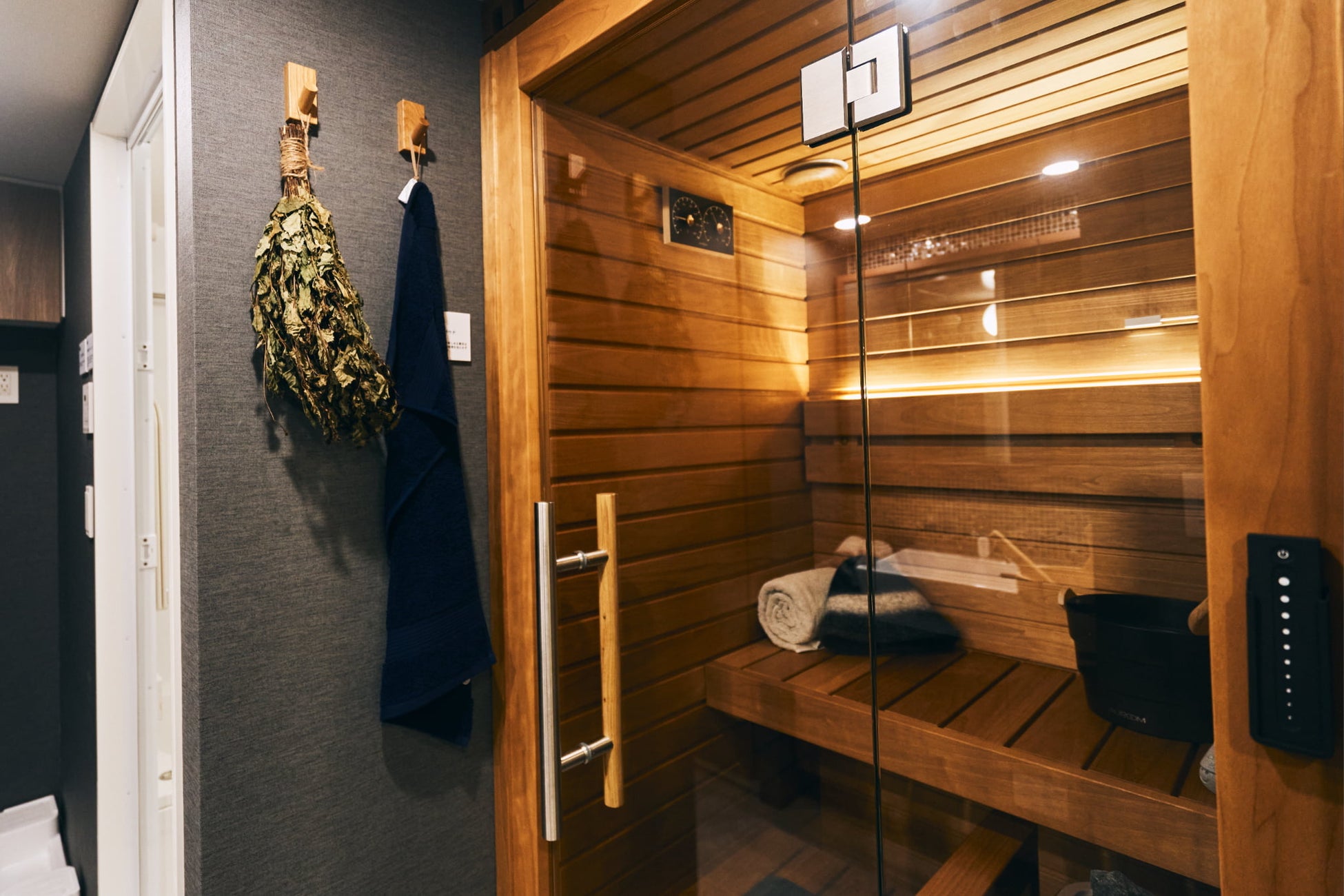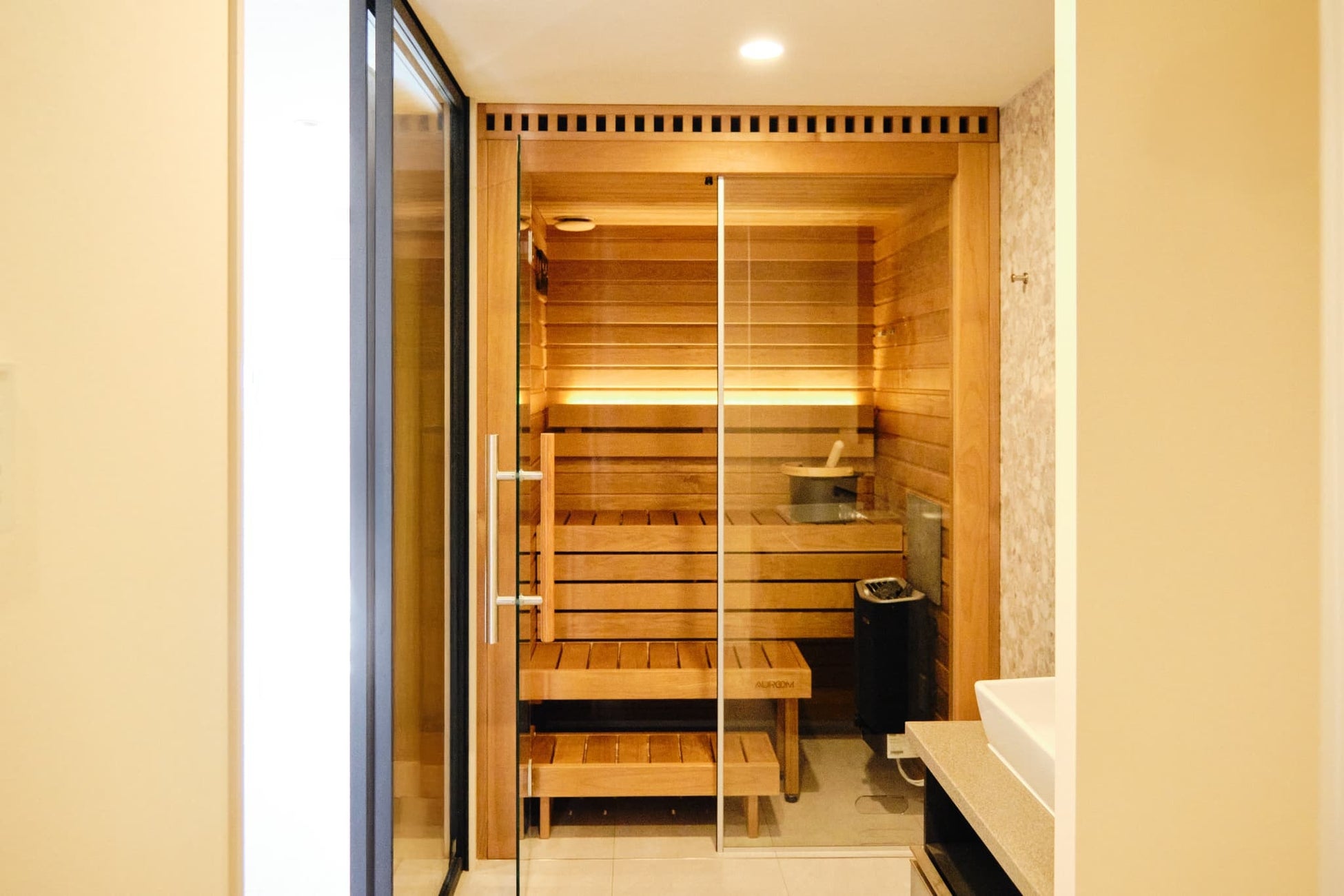 また、ご自宅にも、1台目のサウナとして『Auroom Cala Glass』を、2台目のサウナとしてカスタムオーダーサウナを導入いただいております。