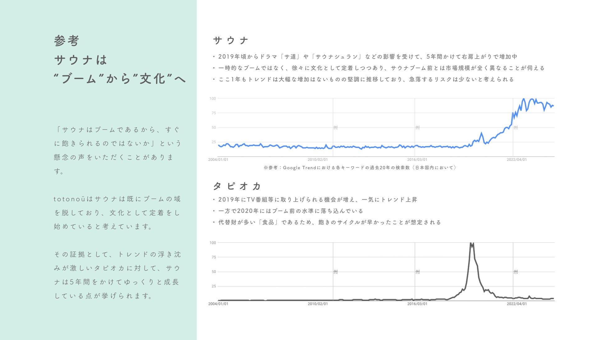 「サウナはブームに過ぎず、すぐに飽きられるのではないか」という懸念の声をいただくことがありますが、 totonoüは「サウナは既にブームの域を脱しており、文化として定着し始めている」と考えています。