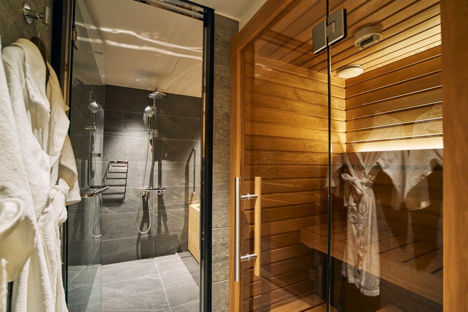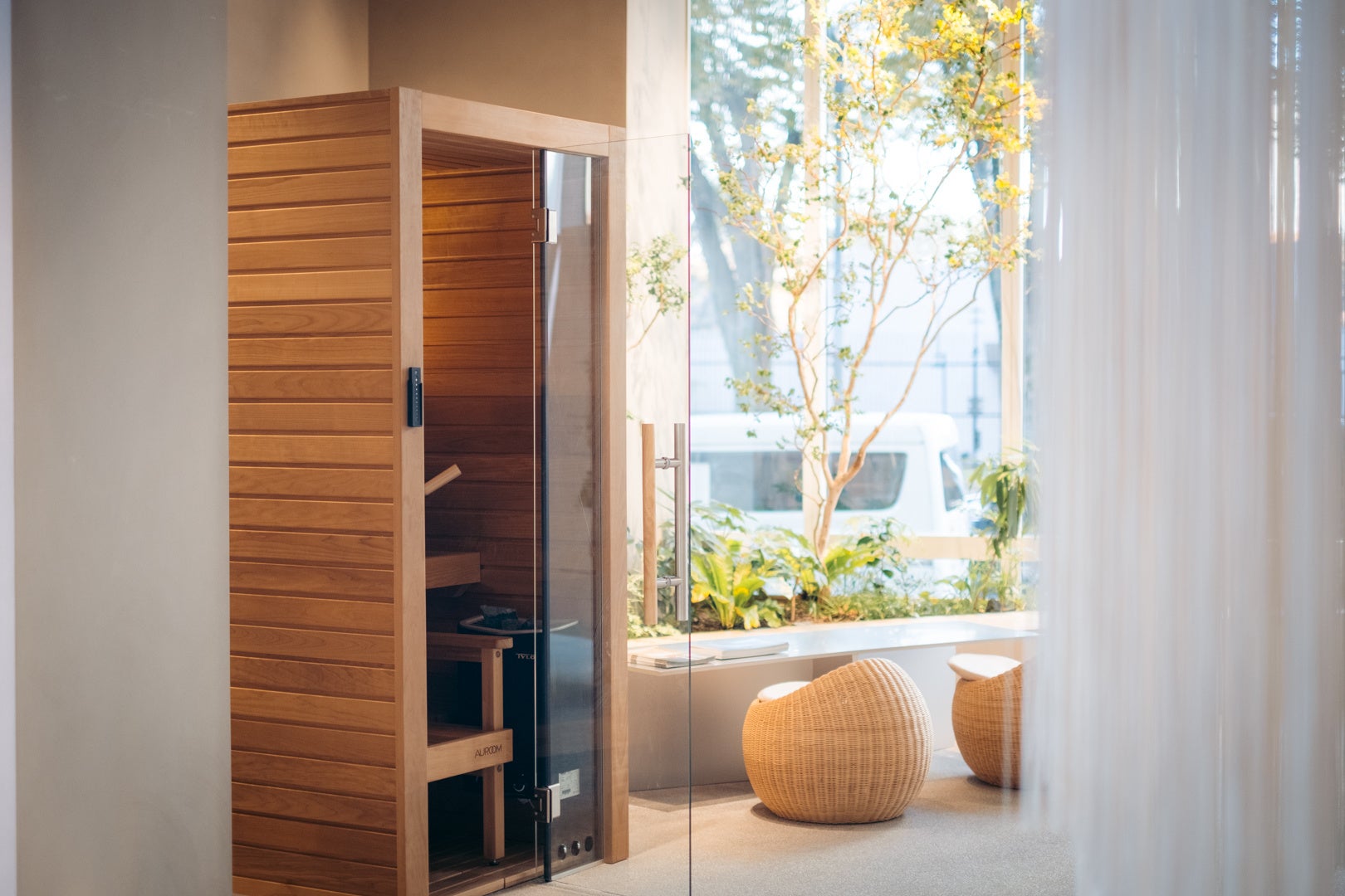 『MODEL S』と『MODEL M』の計3棟に、コンパクトキャビンサウナ『Auroom Cala Mini』を導入いただきました。サウナと浴室がテラスに直結しており、北軽井沢の四季を感じながら外気浴を愉しむことができます。