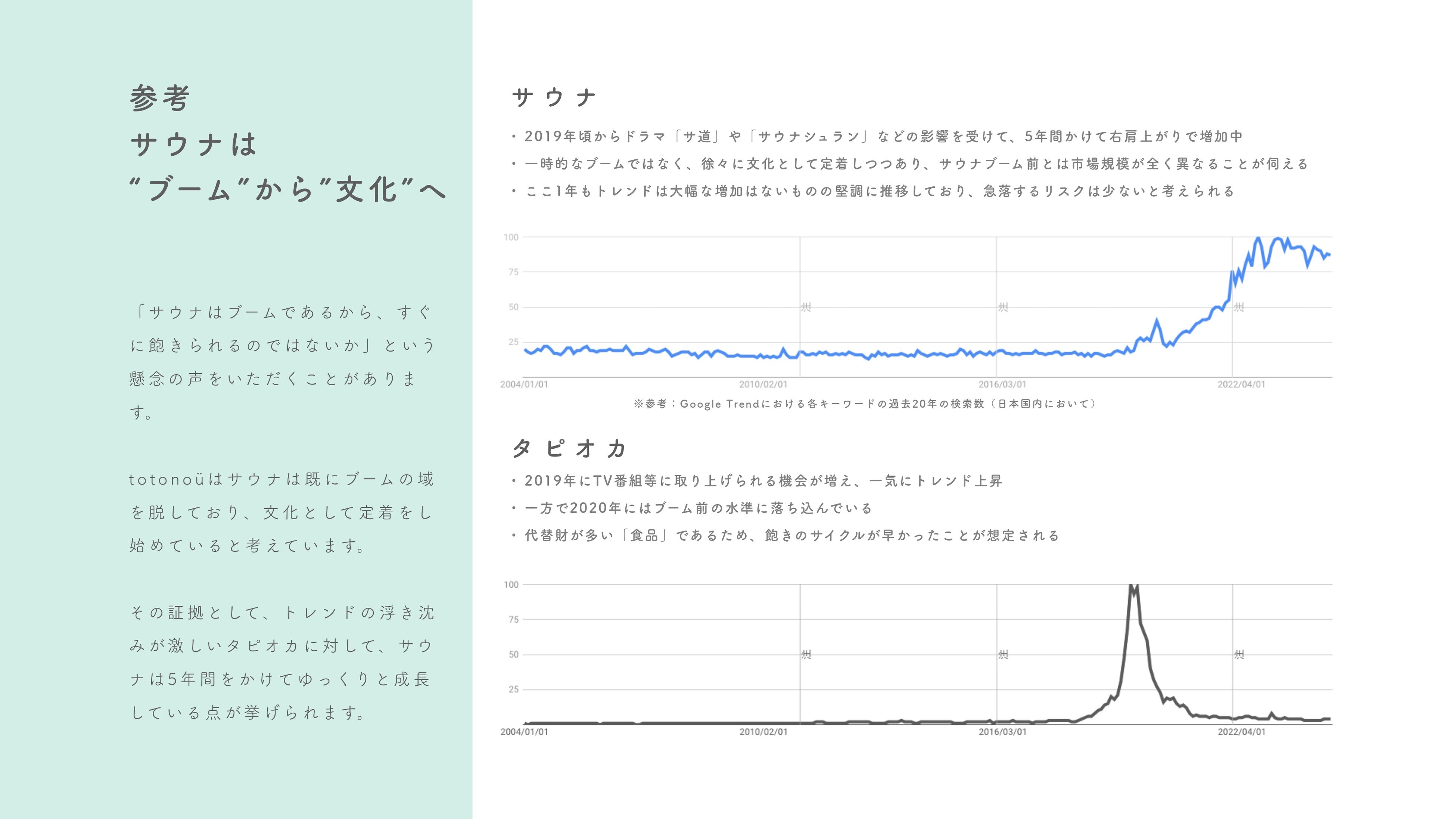 「サウナはブームに過ぎず、すぐに飽きられるのではないか」という懸念の声をいただくことがありますが、 totonoüは「サウナは既にブームの域を脱しており、文化として定着し始めている」と考えています。