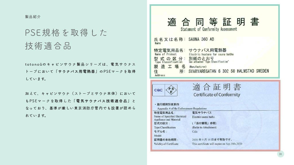また、totonoüのキャビンサウナ製品シリーズは、日本の電気用品安全法(PSE)に適合。電気サウナストーブにおいて『サウナバス用電熱器』のPSEマークを取得しているほか、サウナ製品本体についてもPSEマークを取得した『電気サウナバス技術適合品』となっており、基準が厳しい東京消防庁管内でも設置が認められています。