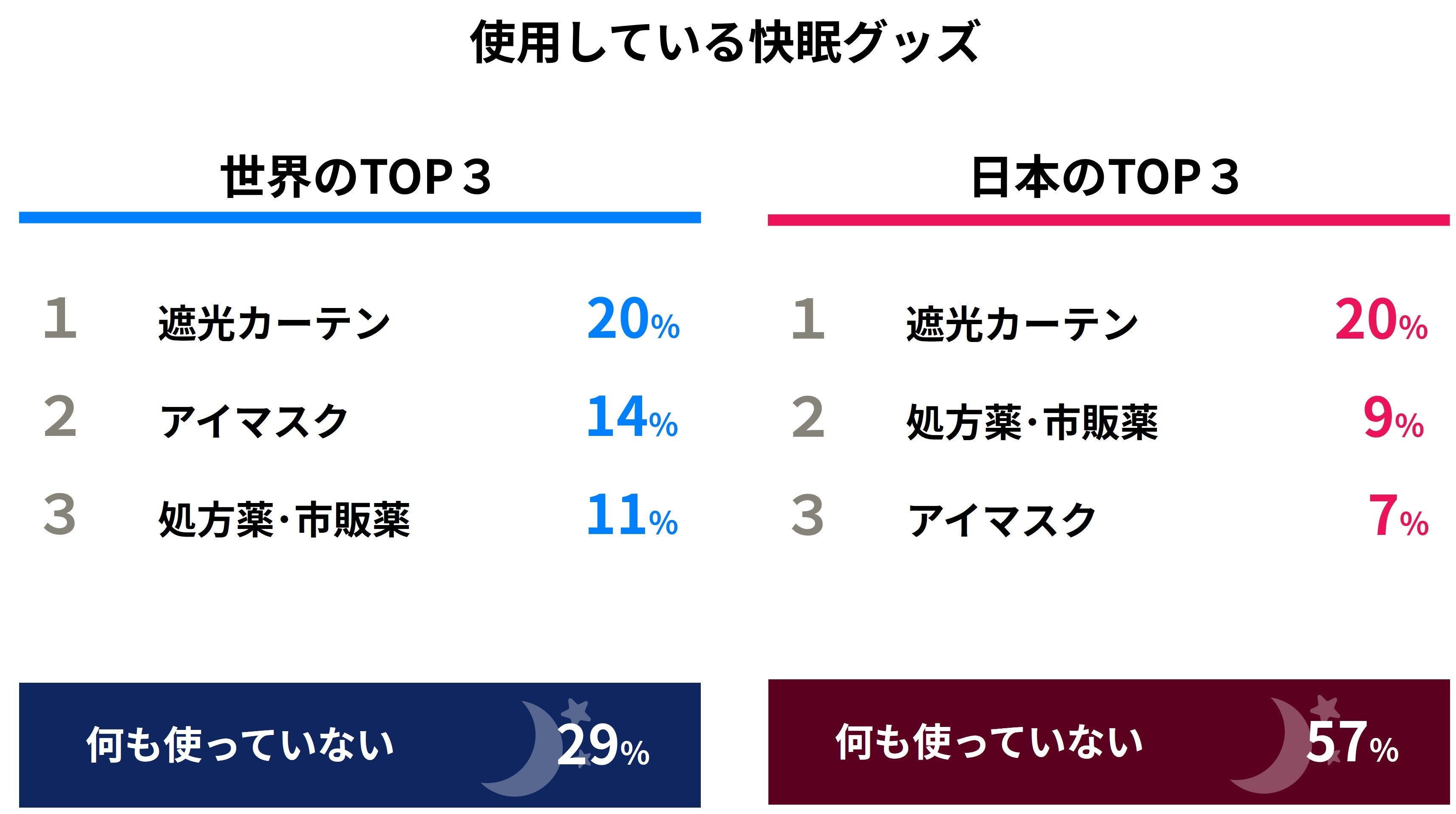 さらに、多くの日本人が睡眠不足を抱えながらも、改善すべき医学的・健康的な課題として捉えておらず、睡眠の改善へ向けて行動していない現状が明らかになりました。睡眠を改善するためのツールや習慣に関する質問では「睡眠改善ツールを何も使っていない」が57.4%(世界平均29.3%)、「睡眠改善の習慣が何もない」が38.4%(世界平均17.9%)と、どちらも世界最下位を記録しました。