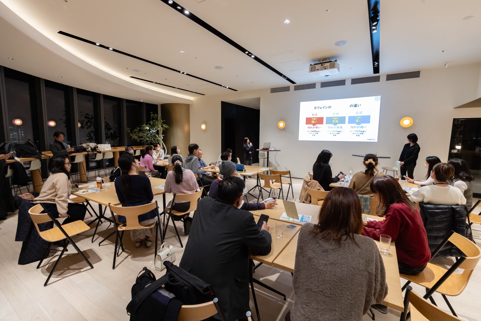 続いて、睡眠や日常生活とも関係の深いカフェイン代謝に関わる遺伝子(CYP1A2)を題材に席替えを実施。同じ傾向を持つ参加者同士で対話することで、カフェインを摂取するという同じ行動でも、身体の反応や感じ方には個人差があることを体感的に理解していきました。