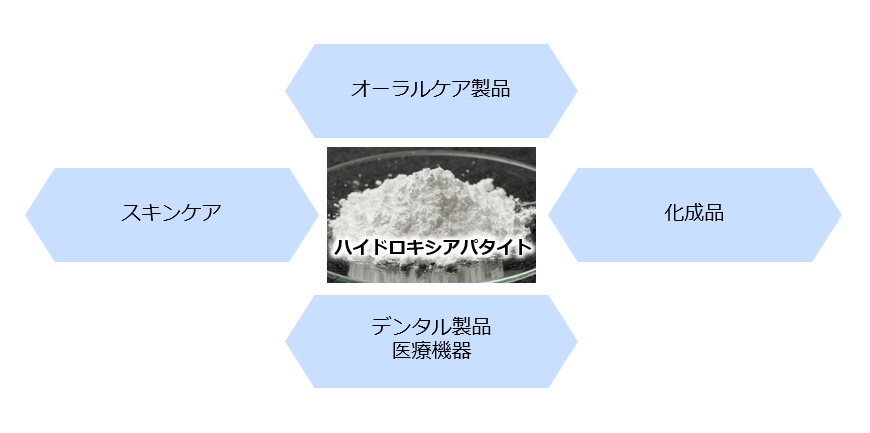 アパタイトは歯科材料や抗菌剤、スキンケア、食品など、さまざまに応⽤される素質があり、サンギではこれらの可能性に挑戦しています。