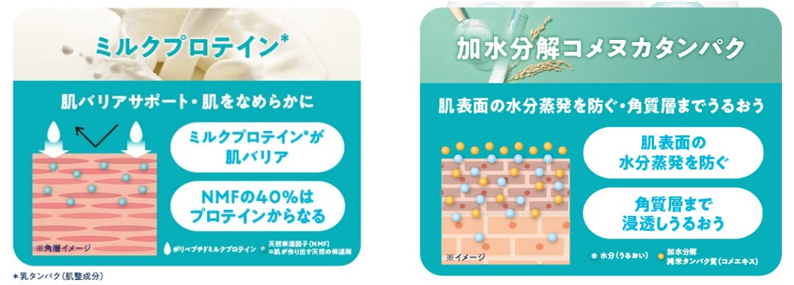 保湿成分として配合したミルクプロテイン*1は赤ちゃんの肌を健やかに保ち、健康な発育をサポート。また、コメエキス*2は赤ちゃんの肌をやわらかくサポートし、乾燥などの外部刺激から守ります。