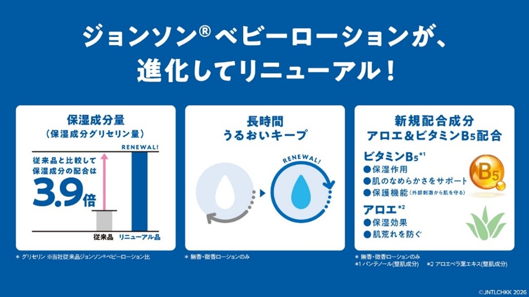 世界売上No.1*ベビー子供用ケアブランドの「ジョンソン®ベビー」は、130年以上続くブランドの歴史において最大級となるリニューアルを実施します。今回の刷新では、新たにジョンソンベビー史上最高保湿*の“ミルク&ライス(M&R)シリーズ”を発売するとともに、既存ローションも安定性の高い保湿成分であるグリセリンなどを当社従来品(無香ローション)比で3.9倍に強化し、より高い保湿効果を実現しました。