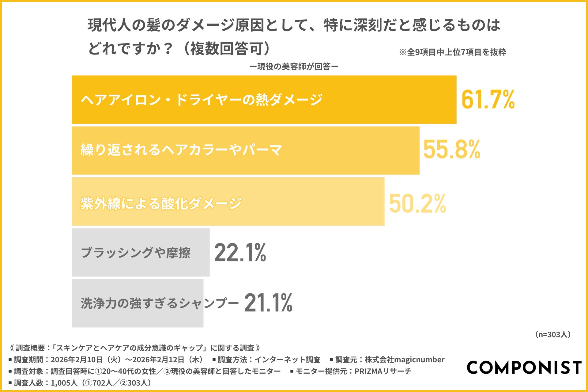 上位を占めた「熱」「薬剤」「紫外線」は、いずれも日々のスタイリングやファッションを楽しむ上で避けることが難しい要因です。特にヘアアイロンやコテでのスタイリングが日常の当たり前となったことにより、熱ダメージが深刻化している現状がうかがえます。