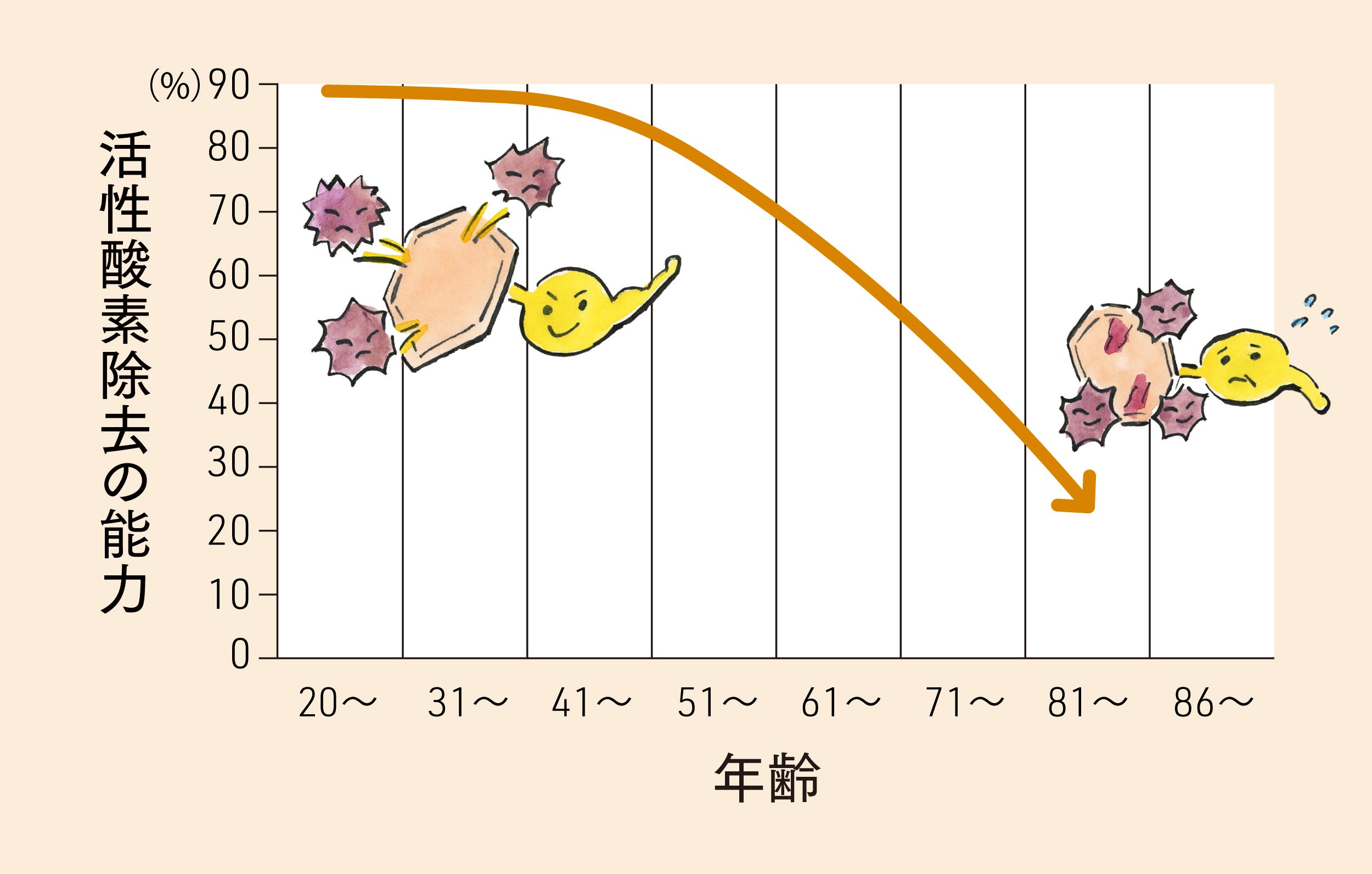 もともと体には、この活性酸素をはねのける「抗酸化力」が備わっているが、加齢などでその力が低下すると、活性酸素の害が上回ってしまう。