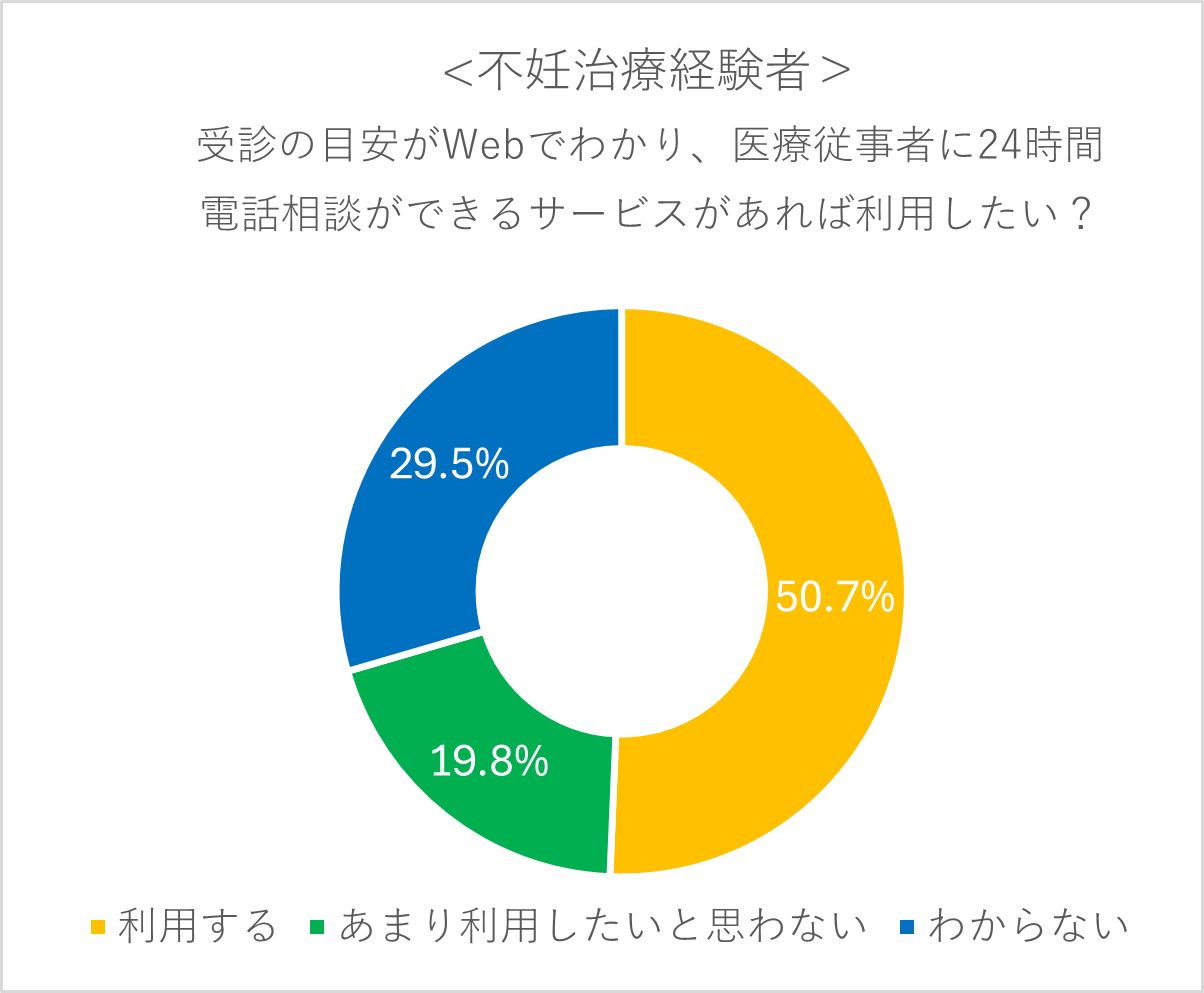 また、受診の判断を迷ったときに働いていたと回答した65.3%が24時間相談窓口を求めているという結果からは、平日の日中に時間的な余裕がないことが背景にあると考えられます。さらに、不妊治療経験者のニーズの高さ(50.7%)は、妊娠前から情報収集や各種治療を経ているため、“妊娠”と向き合う時間の長さや情報過多による精神的な不安より「受診判断のサポート」「ちょっとした不安も聞いてほしい」などの慎重で不安を抱えやすい心理状態にあることがうかがえます。