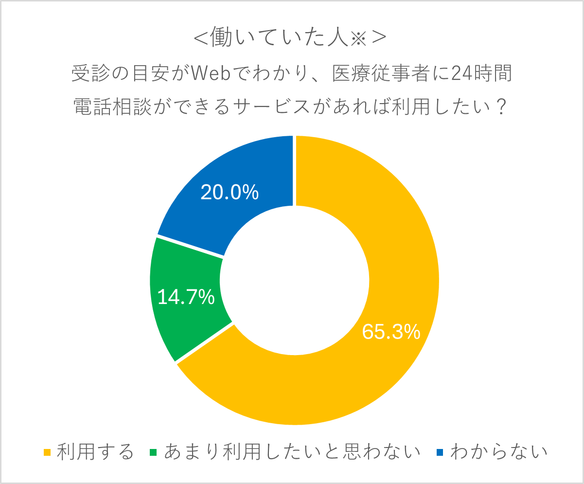 ・ 受診の判断を迷ったときに「働いていた」と回答した人で受診の目安サポート/24時間相談窓口を希望する人: 65.3.%(「働いていない人」の約1.3倍)