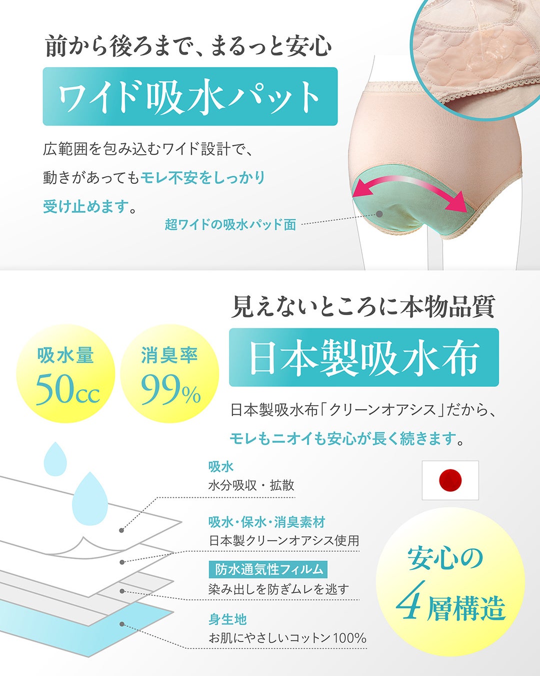 吸水・保水・消臭機能を備えた日本製吸水布「クリーンオアシス」を採用。吸水量は最大50cc、消臭率99%で、防水透湿フィルムを搭載し染み出しを防止。見えない部分まで品質にこだわった安心の構造です。