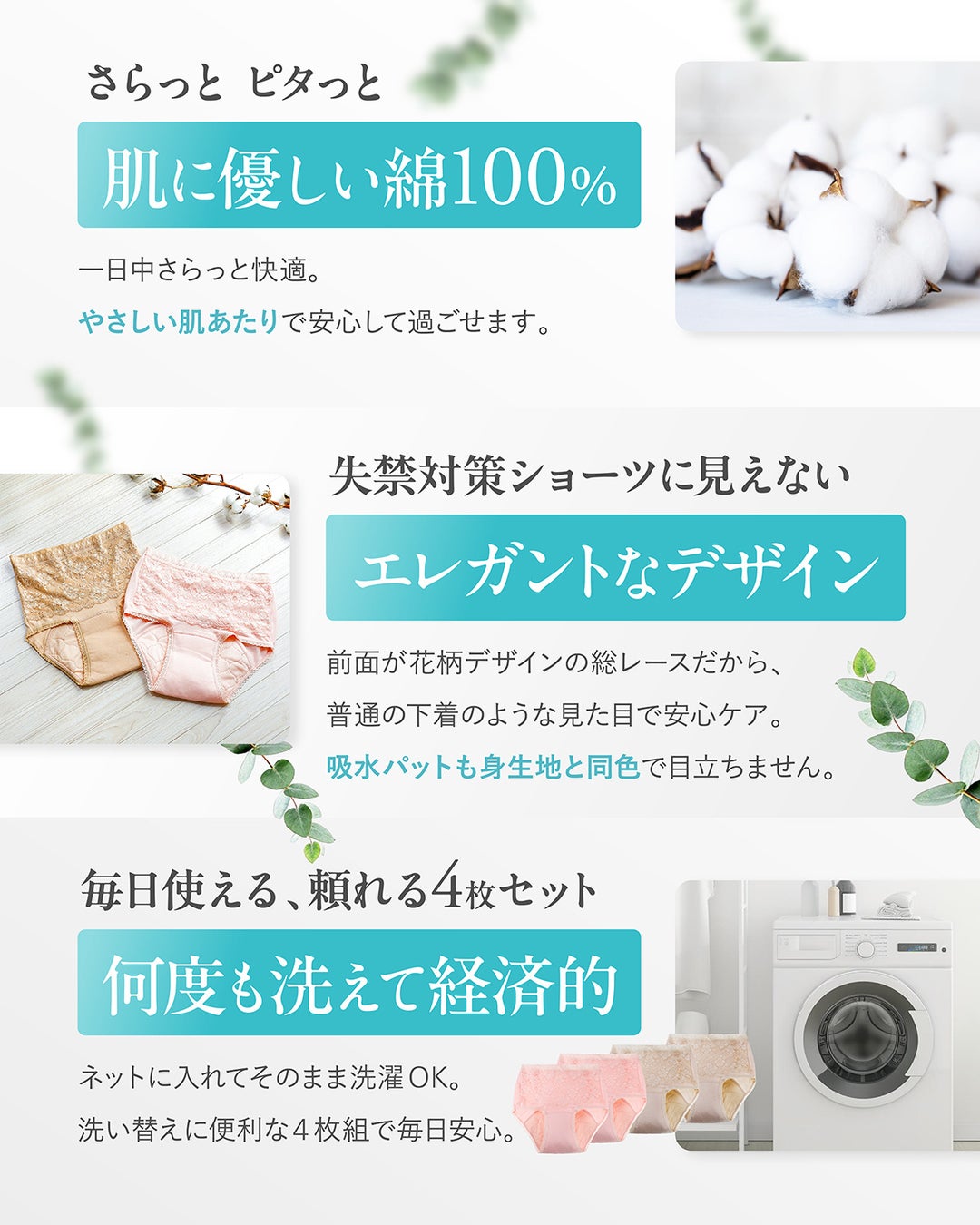 洗濯ネットに入れて洗濯機で洗えるため、お手入れも簡単。4枚セットで毎日使いやすく、繰り返し使用可能(目安:60回以上)。使い捨て吸水パッドと比較すると、1日あたり約19円、月約570円と経済的。年間で約4,000円の節約につながります。