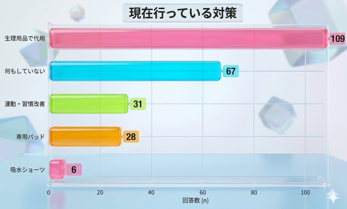 対策として専用の吸水ケア用品を使っている人はわずか約14%にとどまりました。約半数が手近な「生理用ナプキン」で代用していますが、それにより「蒸れや肌のかゆみ(65票)」や「コスト・ゴミが出る(78票)」といった、新たな不快感を抱えていることが判明しました。