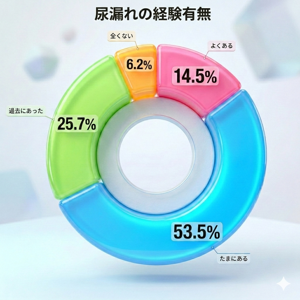 「尿漏れ(ちょい漏れ)を経験したことはありますか?」という質問に対し、経験がないと答えたのはわずか6.2%でした。回答者の構成比は30代・40代が約7割を占めており 、加齢によるものだけでなく、産後の変化や運動時など、若い世代でも多くの女性が直面している悩みであることが伺えます。