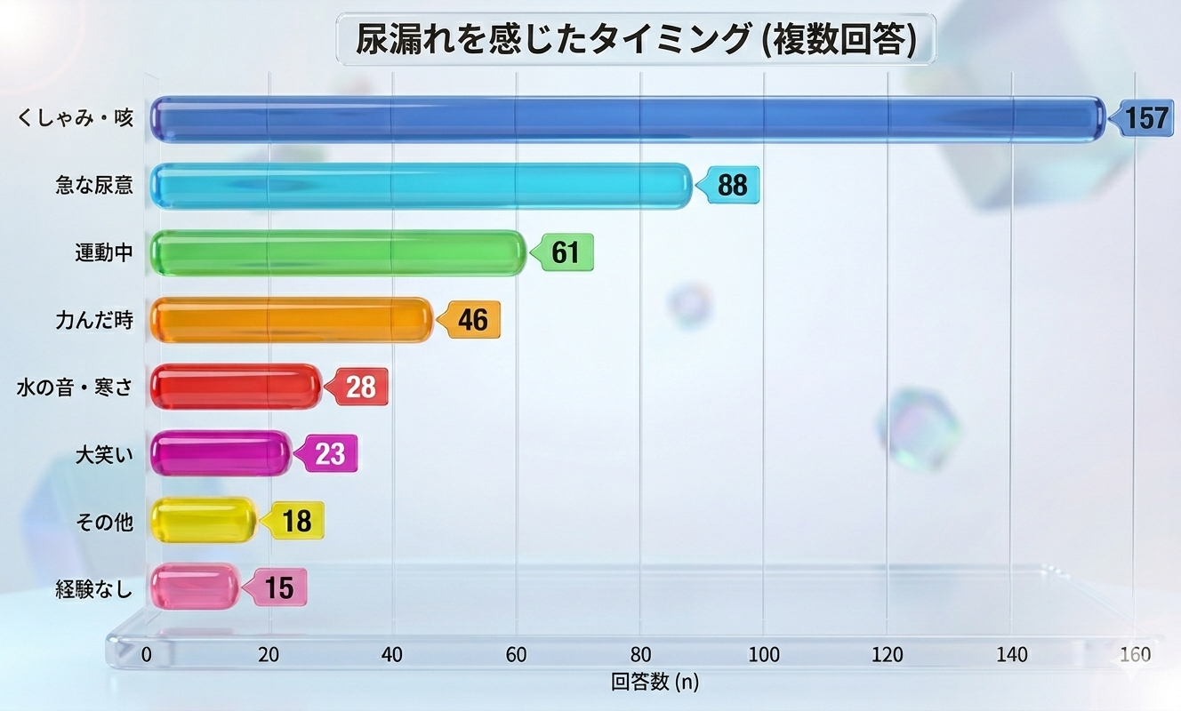 発生シーンのトップは「くしゃみや咳(157票)」ですが、「走ったりジャンプしたり(61票)」や「大笑いをした時(23票)」といった回答も目立ちます。