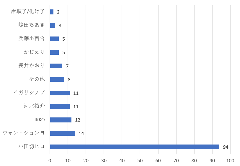 順位は前回と変わらず小田切ヒロさん、IKKOさん、河北裕介さんとなりましたが、1位の小田切ヒロさんは前回(約2年半前)の84票から大きく票を増やし、圧倒的一位に。