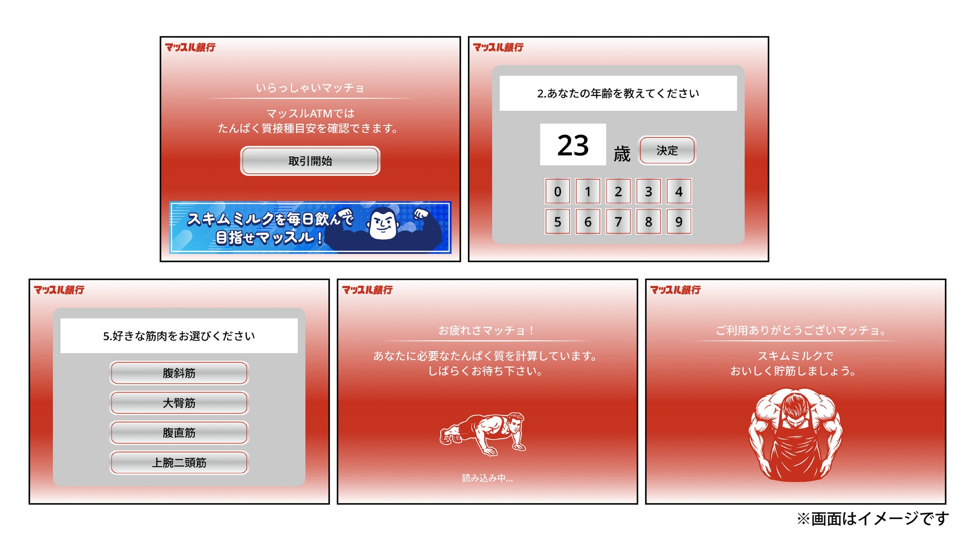体重・年齢・性別・運動習慣を入力すると、1日に必要なたんぱく質が印刷された「ご利用明細票」が出力されるATMです。 自分に必要なたんぱく質量を知り、スキムミルクでおいしく筋肉を蓄える「貯筋(ちょきん)」を促します。また、レシートには店内で販売している商品の中から、自分に合った推奨商品も記載されています。