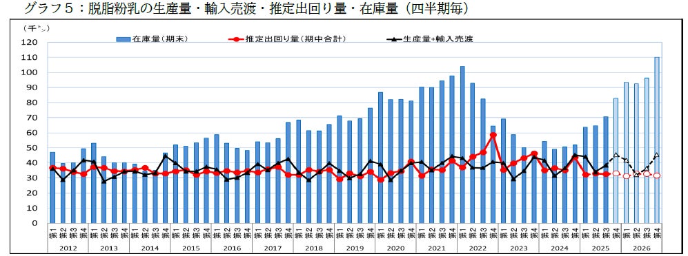 牛乳・乳製品の生産者団体やメーカーなどで構成するJミルクによると、2025年度末(2026年3月末)の脱脂粉乳在庫量は8万2,800トン(前年度比約59%増)に達する見込みで、一般的に「多い」とされる5万トン水準を大きく上回る過剰在庫が続いています。