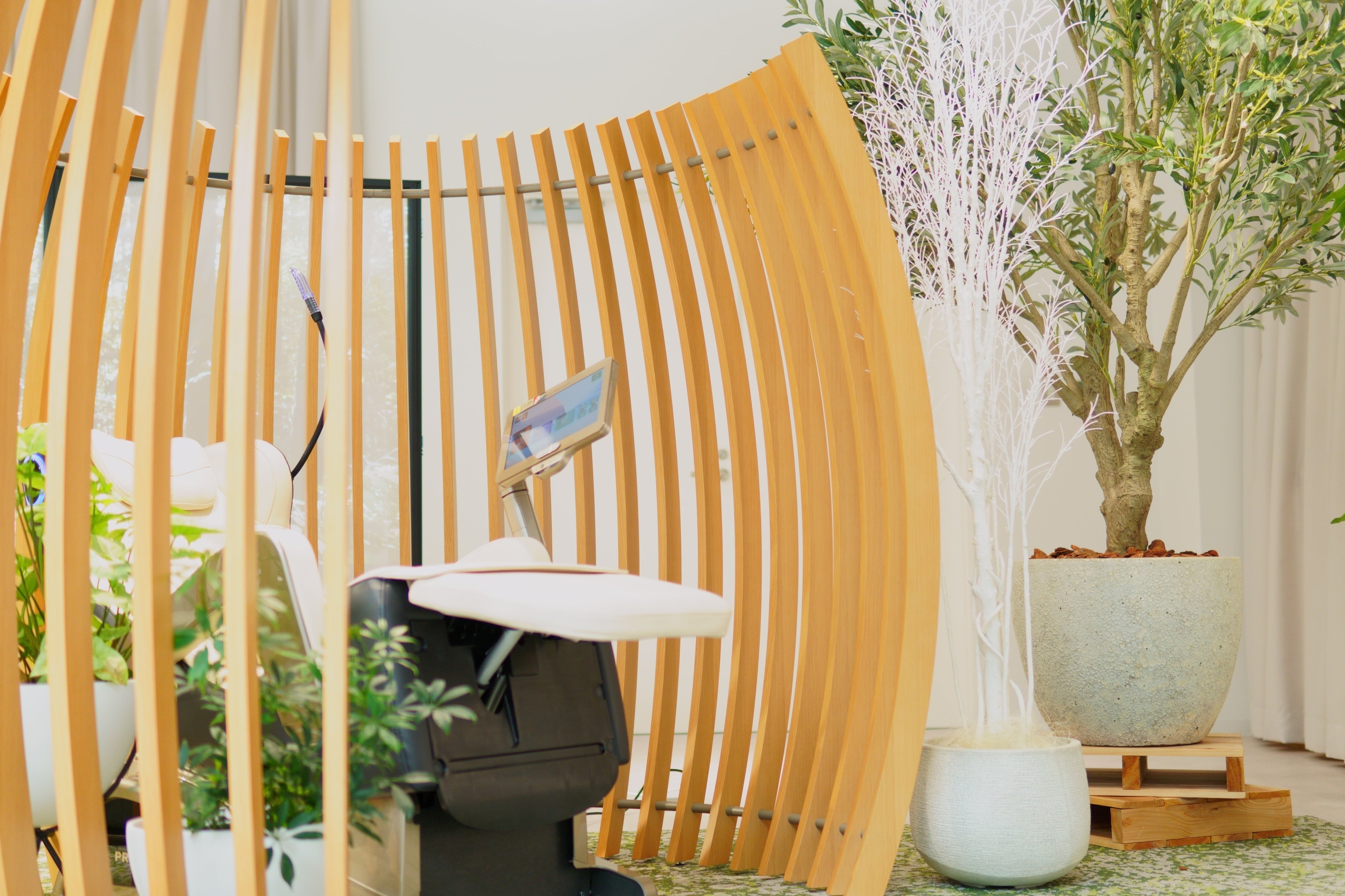 酸素チェアによる高い快適性と、ルーバーが生み出す、包まれ感のある構成により、周囲から緩やかに切り離された、質の高いプライベートリラクゼーション体験を提供します。