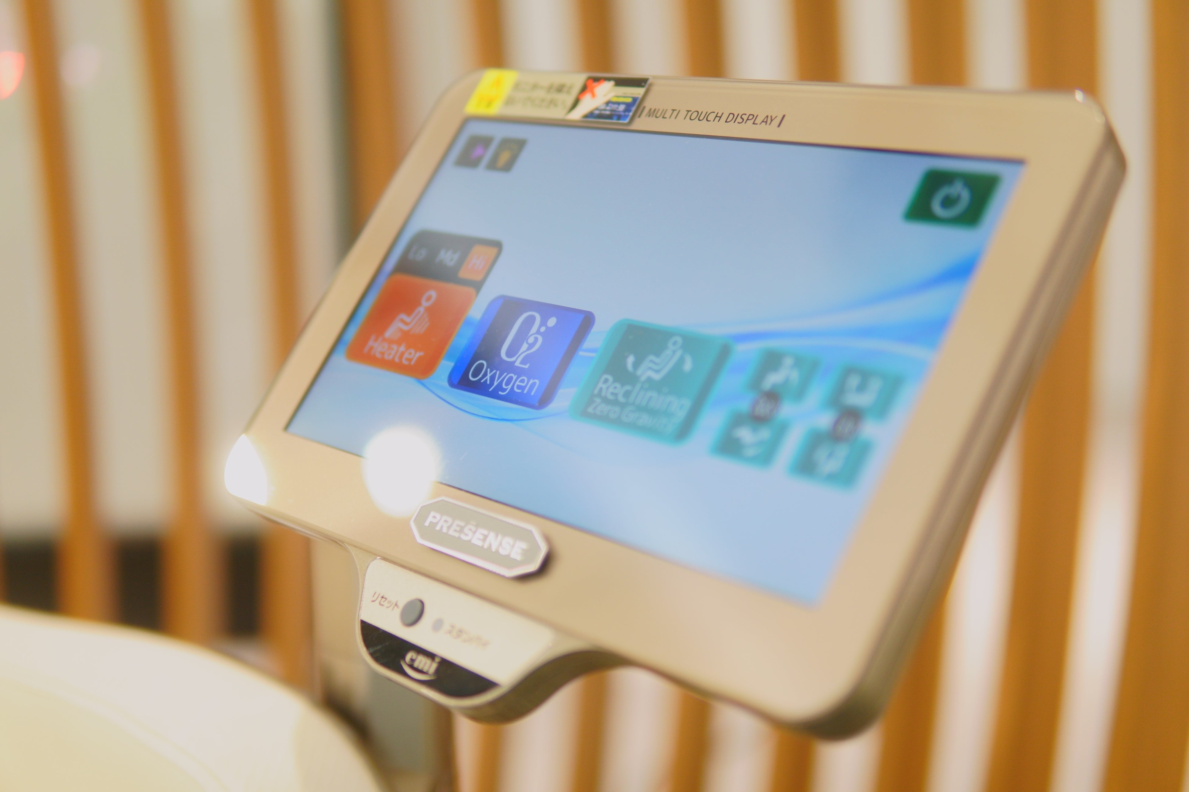 酸素チェアの操作部は、シンプルな英語表記とピクトグラムを併記したタッチパネルを採用し、初めての方でも直感的に操作できる設えとしています。