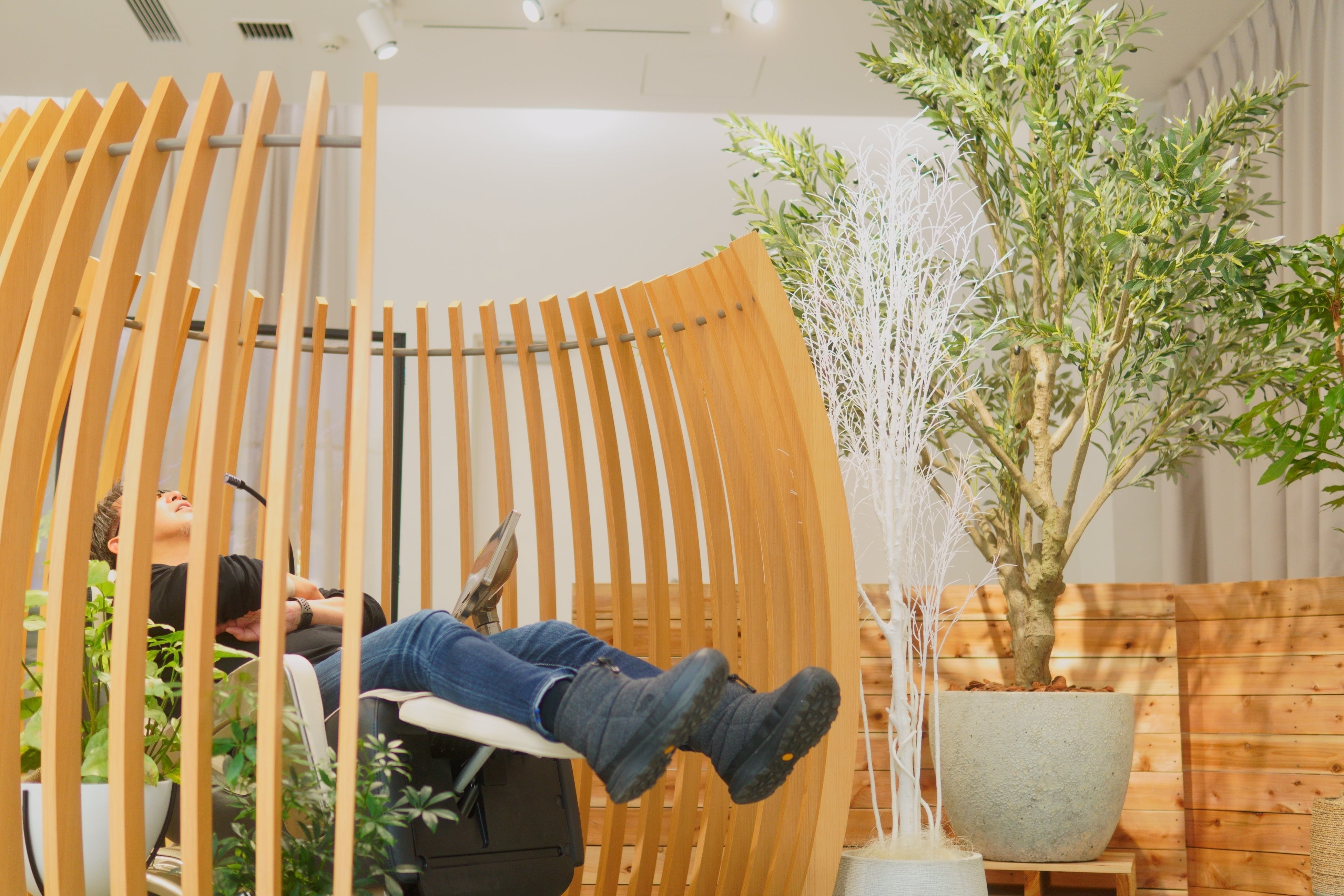 やわらかな木製のルーバーに包まれた空間は、周囲の視線や気配を穏やかに遮り、利用者が自然とリラックスできる環境を生み出します。