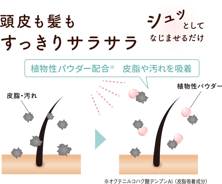 スプレータイプで、気になった時に簡単に使えるのがポイント。植物性パウダー※や頭皮クリア成分(リモネン)を配合し、頭皮と髪のべたつきを抑えて、洗い立てのようなふんわりさらさらな髪に仕上げます。