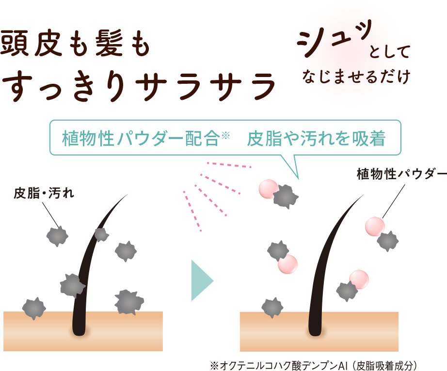 スプレータイプで、気になった時に簡単に使えるのがポイント。植物性パウダー※や頭皮クリア成分(リモネン)を配合し、頭皮と髪のべたつきを抑えて、洗い立てのようなふんわりさらさらな髪に仕上げます。