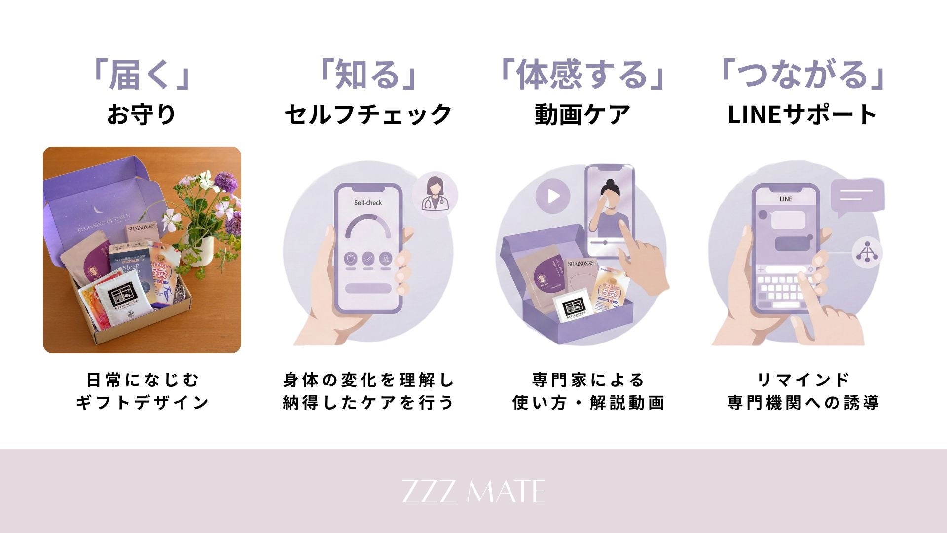 現代は手軽なeギフトも普及していますが、zzzMate Giftは「手元に置く実在感」にこだわりました。 産後の慌ただしい日常の中で、自分のために用意された「心が動くボックス」が目に触れる場所に置かれている。その視覚的な体験が「自分を大切にするモード」へ切り替え、意識変容を与えると考えています。日常の一部として睡眠(休息)が溶け込み、お守りのように寄り添う存在になることを目指しています。