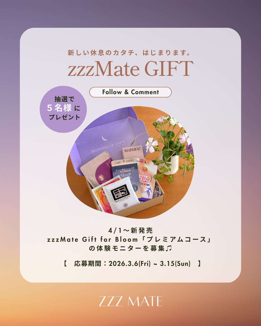 現代を生きる女性のライフスタイルを睡眠からデザインするブランド「zzzMate(ズズメイト)」(兵庫県神戸市、代表:鈴木麻誉)は、第一弾サービスとして、産後の心身に休息のきっかけを届けるセルフケアギフト「zzzMate Gift for Bloom(ズズメイトギフトフォーブルーム)」を2026年4月1日(水)より発売します。