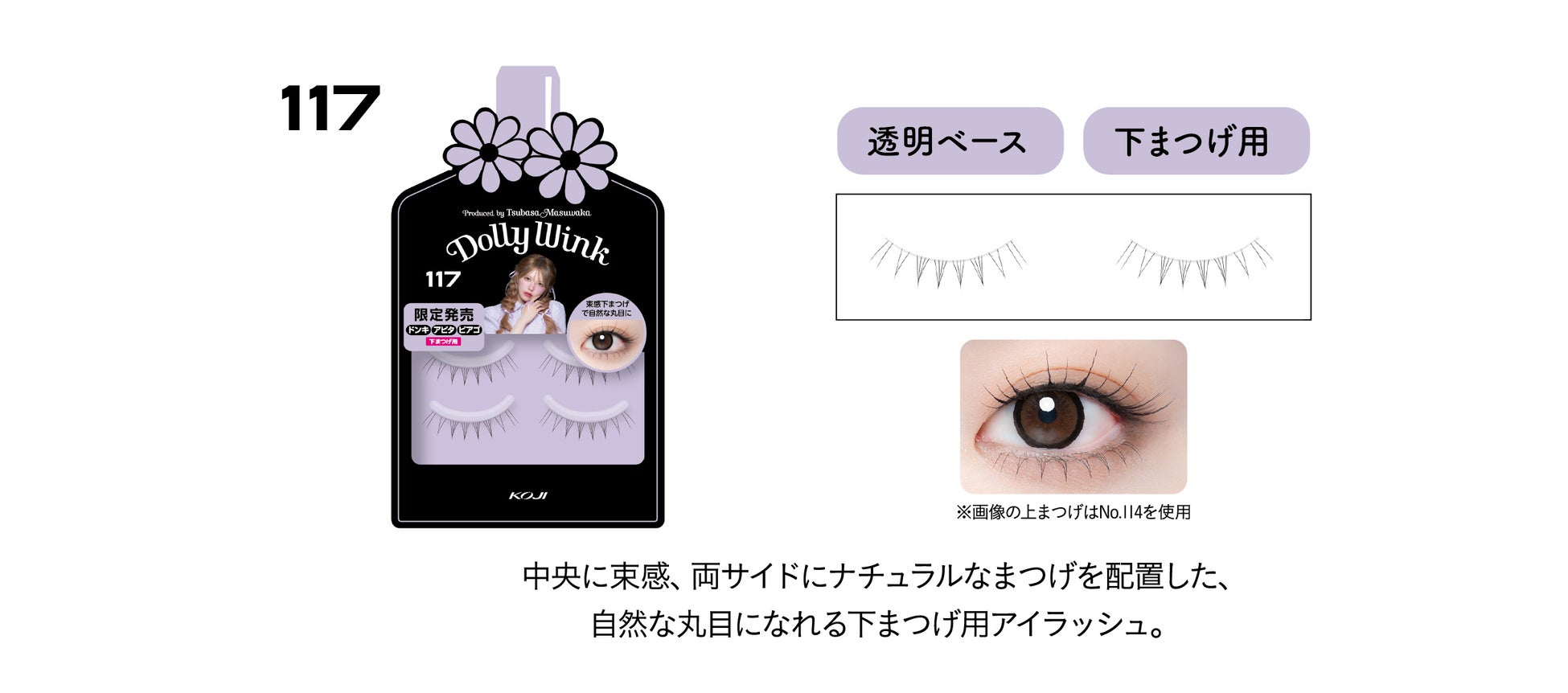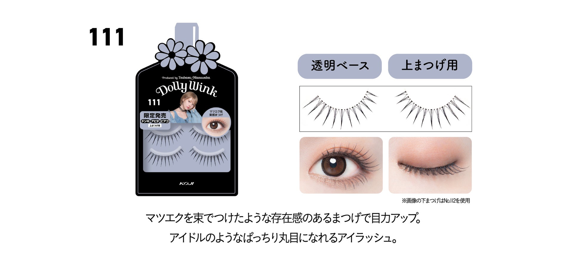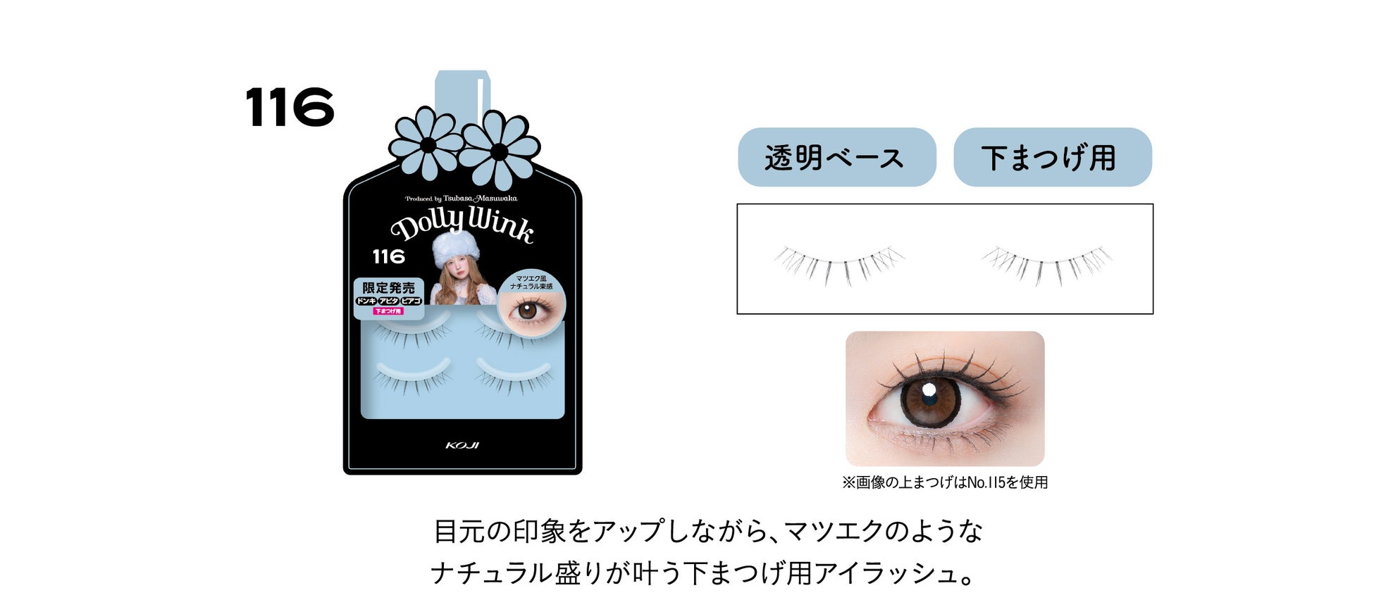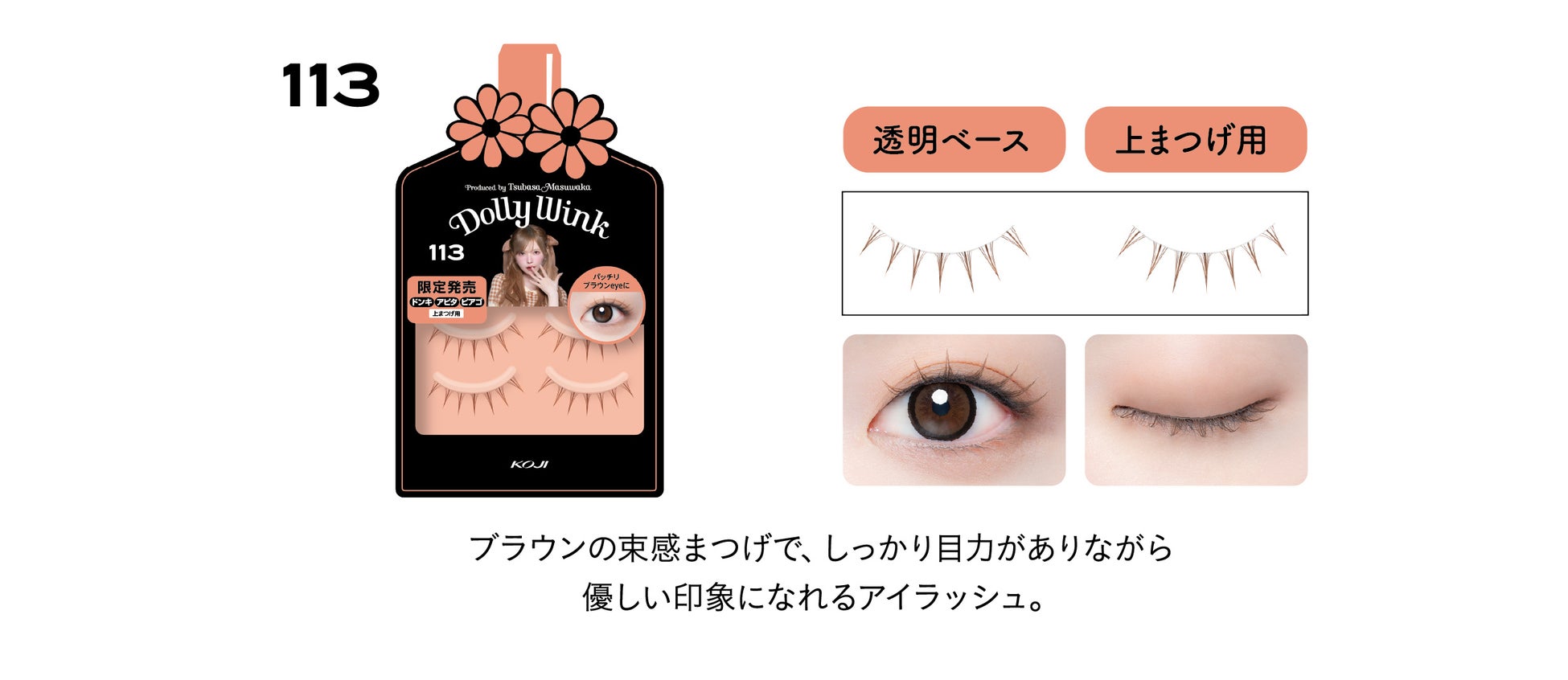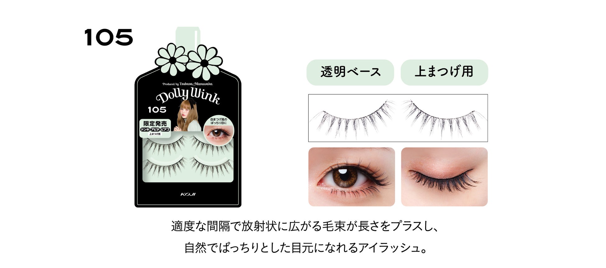 益若つばさプロデュースのDOLLY WINKアイラッシュシリーズは、累計販売数1805万個※を突破し、ご好評いただいているシリーズです。中でもドン・キホーテ系列店舗、アピタ、ピアゴ限定デザインは、しっかり盛れて大人カワイイ目元がつくれるデザインのつけまつげとして、つけまつげヘビーユーザーにご評価いただいています。