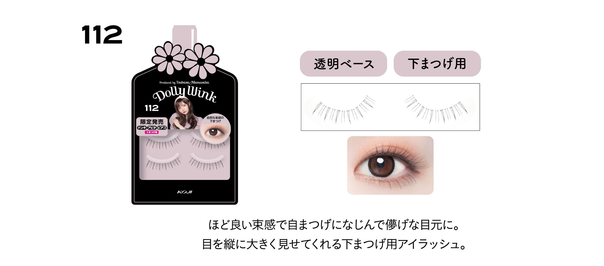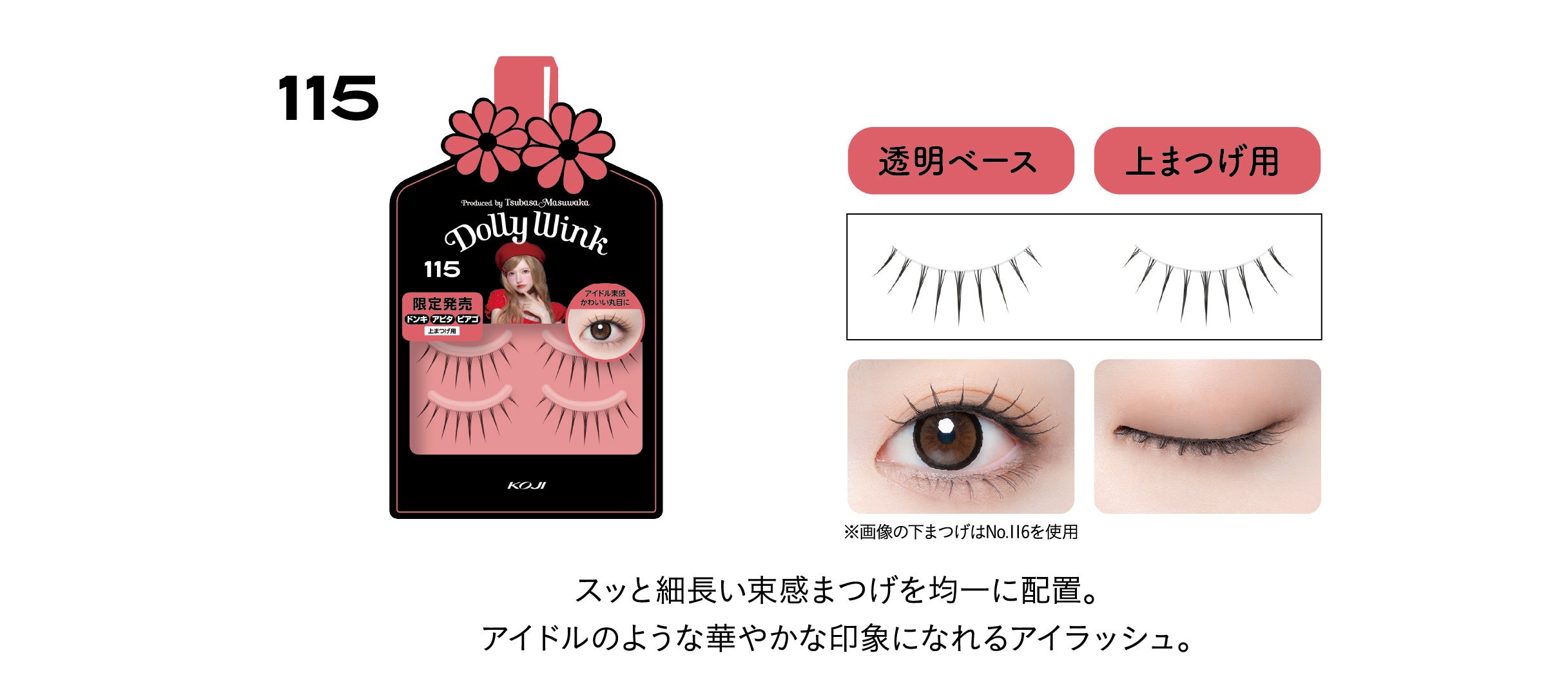 益若つばさプロデュースのDOLLY WINKアイラッシュシリーズは、累計販売数1805万個※を突破し、ご好評いただいているシリーズです。中でもドン・キホーテ系列店舗、アピタ、ピアゴ限定デザインは、しっかり盛れて大人カワイイ目元がつくれるデザインのつけまつげとして、つけまつげヘビーユーザーにご評価いただいています。