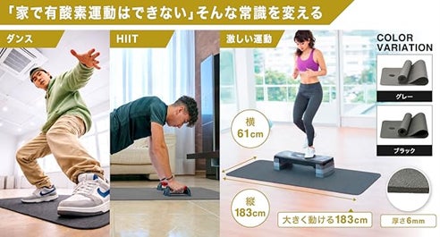 両製品ともに、縦183cm×横61cm、厚さ6mmのサイズ設計。高密度設計による適度なクッション性で、関節への負担を軽減します。