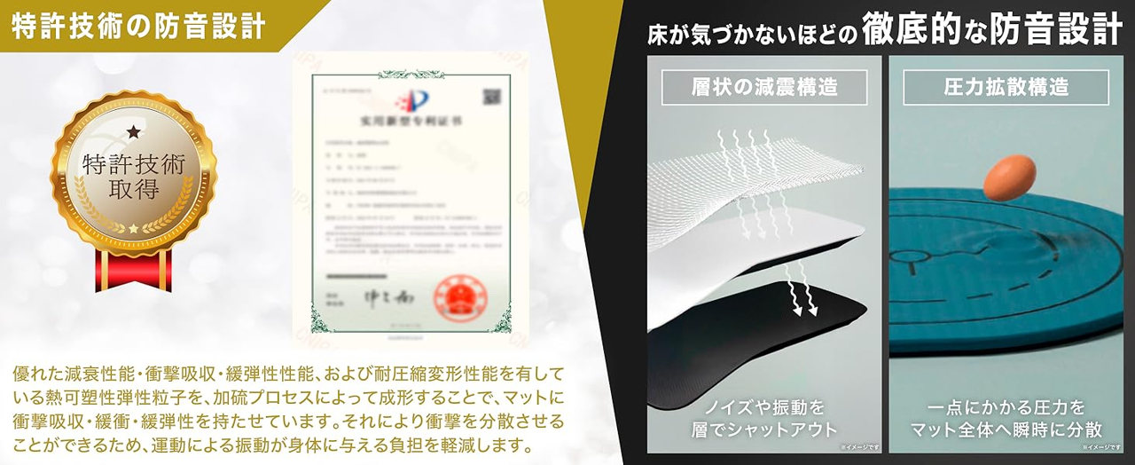 トレーニングマットには、衝撃吸収に特化した特許素材「SA新素材」を採用しております。