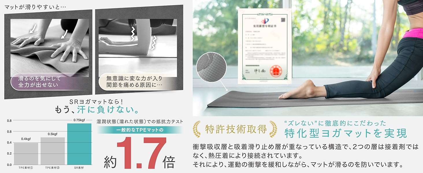 特許取得の「SR素材」を採用し、滑りにくさと弾力性を高次元で両立したヨガマットです。