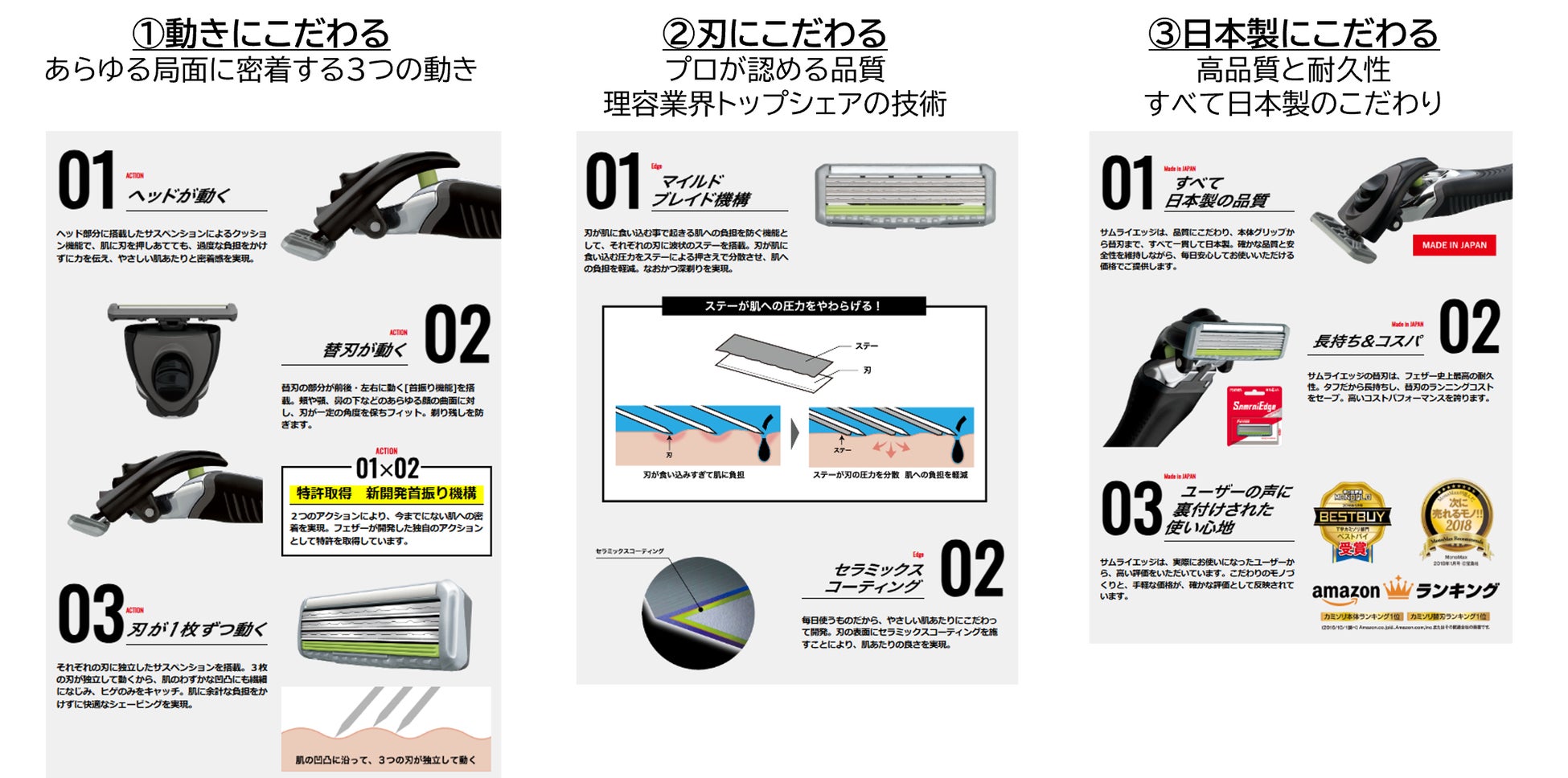 シェービングにおいて理容業界トップシェアを誇る老舗ブランド フェザーが、確かな技術でこだわり抜いて開発したT字カミソリ 『サムライエッジ』。グリップ本体も替刃もすべてが日本製です。『サムライエッジ』は、3つのこだわりで、やさしい肌あたりと深剃りを実現します。