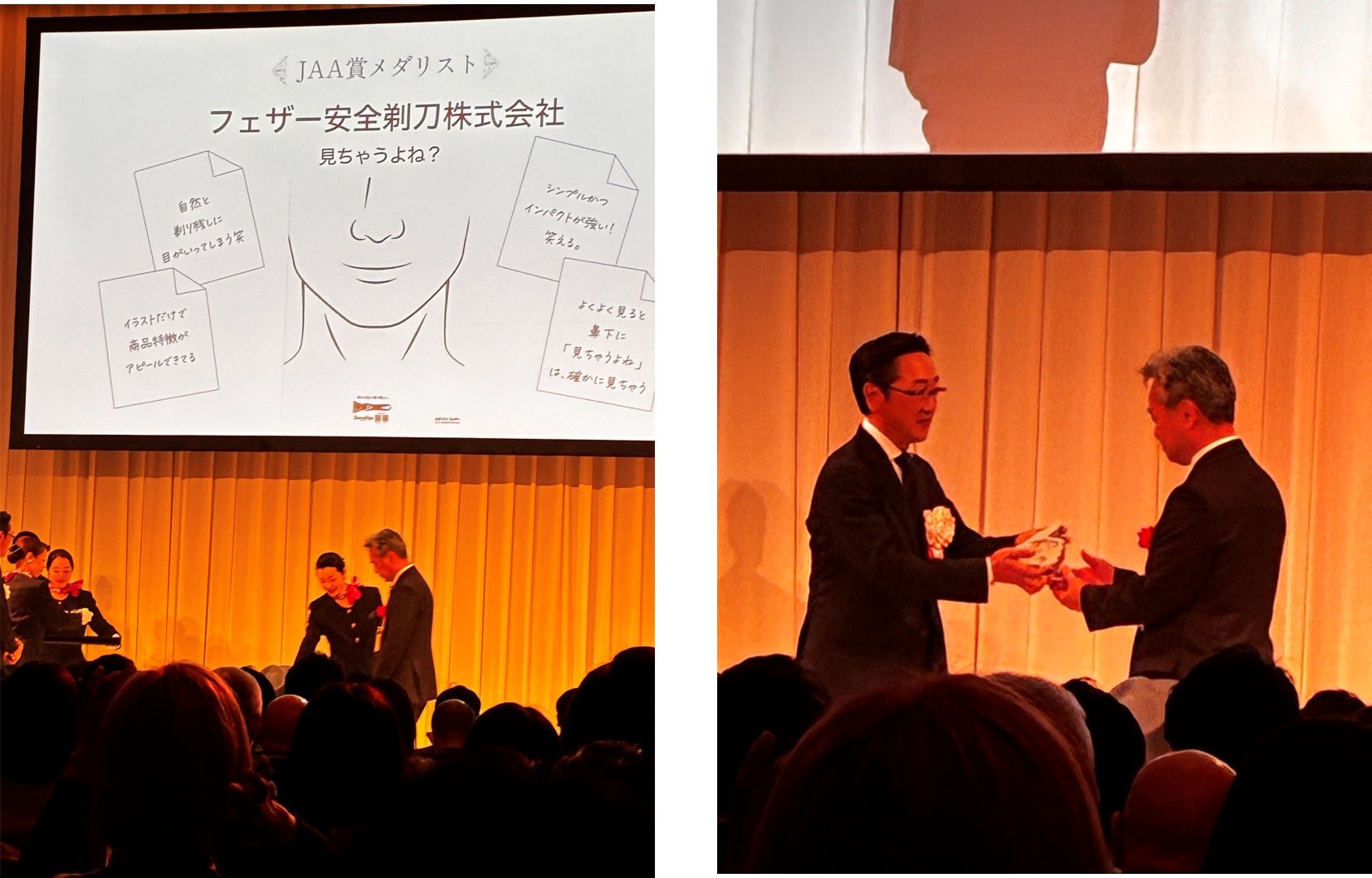 当社製品「サムライエッジ」の広告は、第63回JAA広告賞「消費者が選んだ広告コンクール」において、996件の応募の中から入賞67作品に選ばれ、プリント広告部門で「メダリスト」を受賞いたしました。描かれた人物の鼻の下などに小さく「見ちゃうよね」の文字を記したデザインで、「意外と目立つ剃り残しに。」のキャッチコピーに強い説得力とユーモアを与えて製品を訴求しています。