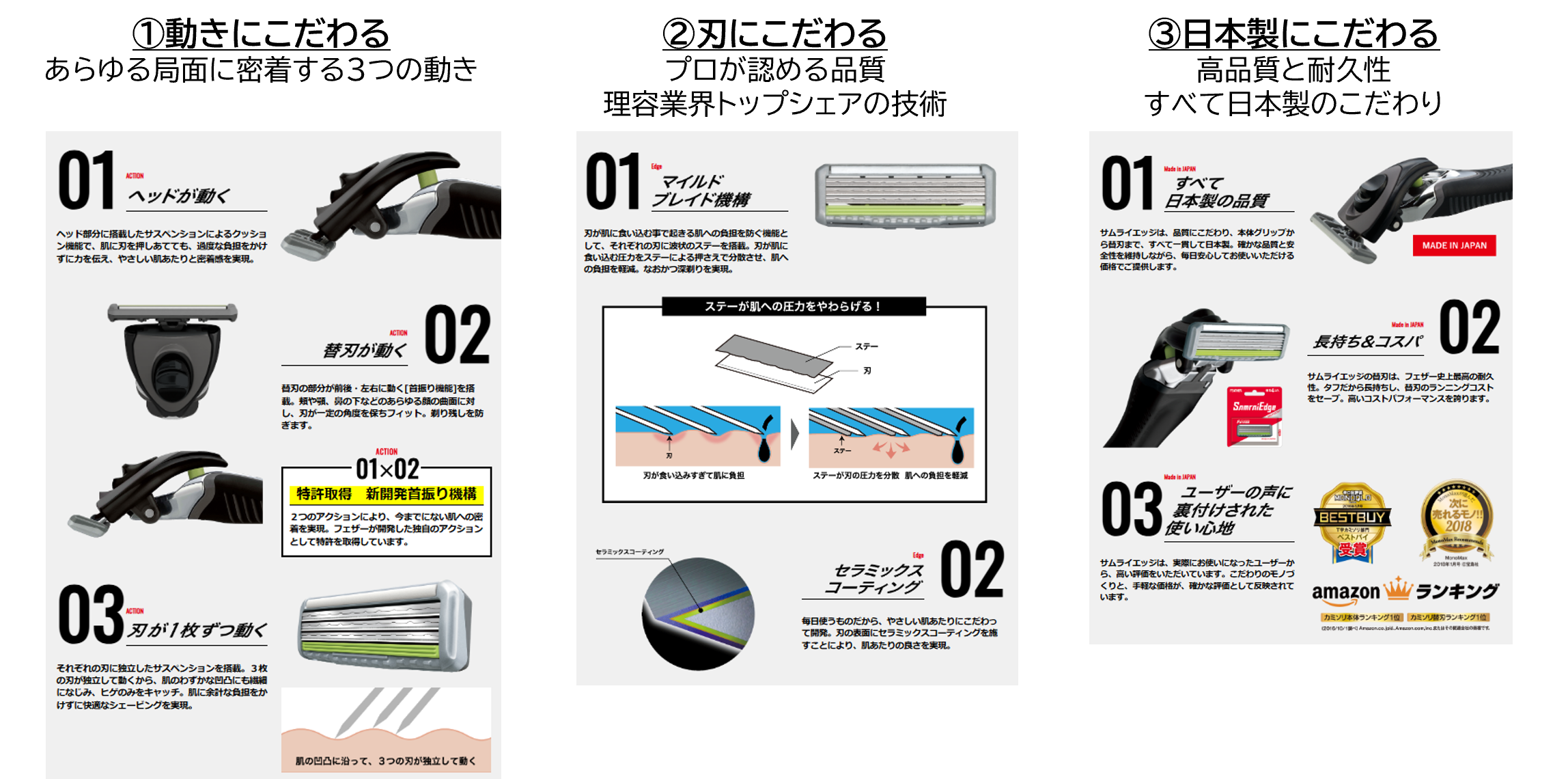 シェービングにおいて理容業界トップシェアを誇る老舗ブランド フェザーが、確かな技術でこだわり抜いて開発したT字カミソリ 『サムライエッジ』。グリップ本体も替刃もすべてが日本製です。『サムライエッジ』は、3つのこだわりで、やさしい肌あたりと深剃りを実現します。